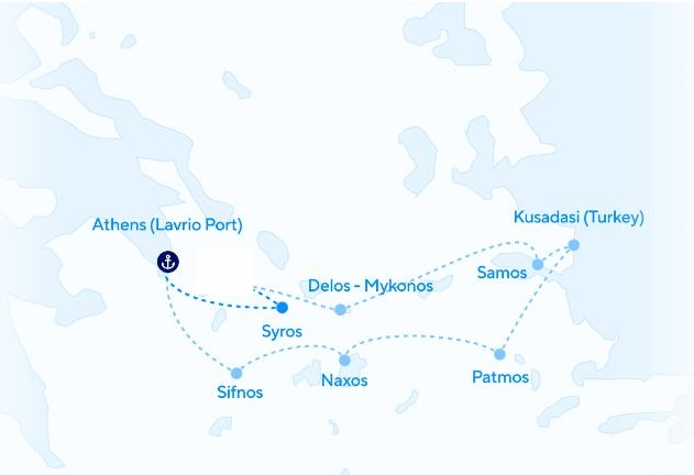 Sail into the heart of the Aegean aboard the M/Y Variety Voyager, where myth, history, and island charm come together. Departing Athens (Lavrion), this boutique yacht cruise explores the Cyclades and Eastern Aegean with visits to Syros, the sacred ruins of Delos, cosmopolitan Mykonos, historic Samos, and Kusadasi - the gateway to the legendary city of Ephesus. Continue to the spiritual island of Patmos and the authentic beauty of Naxos and Sifnos before returning to Athens. With just 72 guests onboard, refined dining, and a relaxed pace that allows time for exploration, this intimate journey offers an effortless and immersive way to discover the timeless treasures of Greece and Turkey