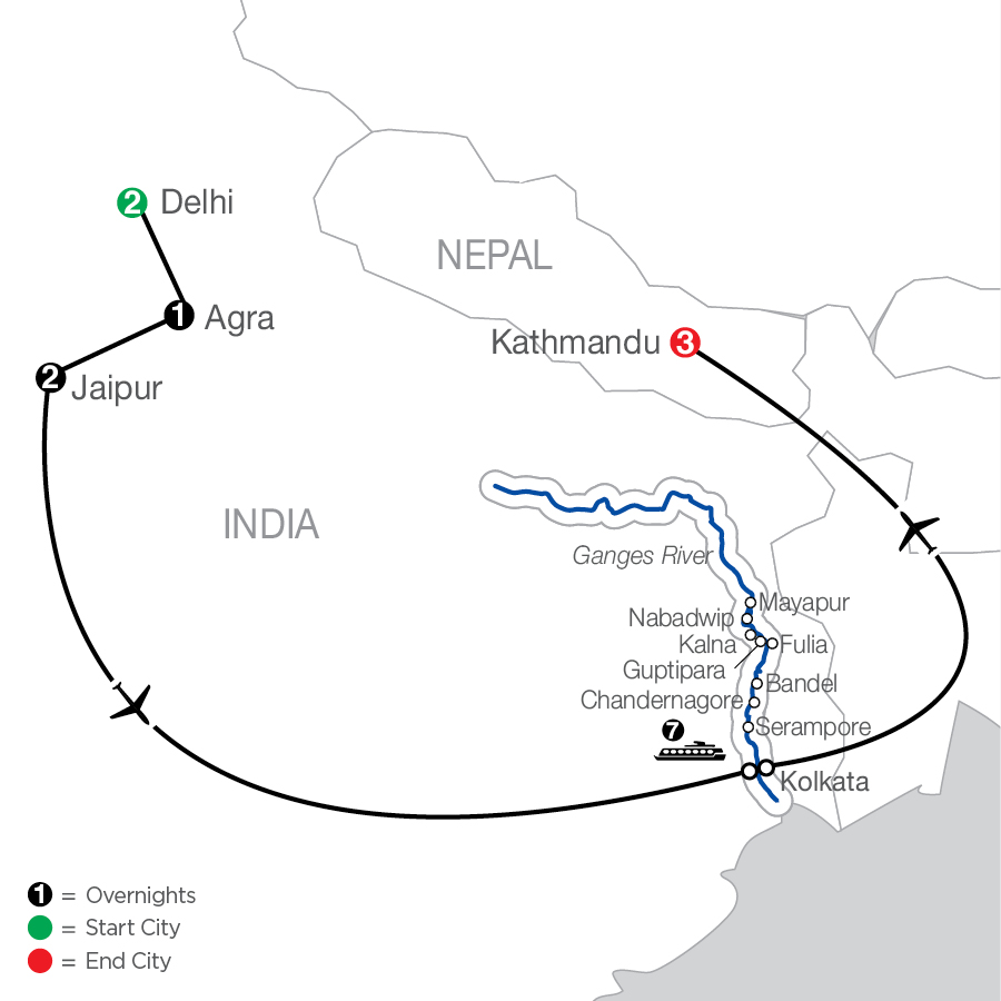 Discover a world of color, culture, and the cherished spiritual heritage of India. Your guided tour of India and Nepal with Ganges River cruise begins in the bustling city of Delhi. You’ll tour the city with your expert Tour Director and take a rickshaw ride through the Chandni Chowk bazaar—brimming with everything from silver and spices to saris of every color. You’ll visit Qutub Minar—the world’s largest brick minaret and see Delhi’s largest Sikh gurudwara (house of worship), before traveling to Agra—site of the legendary Taj Mahal. You’ll encounter more stunning sights with a sunset excursion to the Taj Mahal—the iconic memorial built by Moghul emperor Shah Jahan for his beloved wife. More than 20 years in the making, the Taj Mahal stands as the pinnacle of love’s devotion, where you’ll also have the opportunity to experience this iconic site at sunrise. You’ll continue to the city of Jaipur, with its famous Palace of the Winds, and spectacular Amber Fort, before flying to Kolkata to board your cruise on the Ganges River—the holy river of Hinduism, as it slowly courses through one of the world’s most fertile and populated areas. Along its banks, human life is connected to its waters where you’ll get a glimpse of life apart from India’s big cities. From fascinating muslin weaving in Nabadwip and pottery making in Guptipara, you’ll explore the fascinating Hare Krishna headquarters in Mayapur and visit the stunning Hooghly Imambara upon your return to Kolkata. In Kathmandu, sightseeing is spread over two leisurely days. Visits include Hanuman Dhoka, a UNESCO World Heritage Site, and the Temple of Kumari, residence of the Living Goddess, a child thought to be the reincarnation of a Hindu goddess. You’ll also journey to Patan and Bouddhanath, Nepal’s largest stupa. All of this and more await you on this once-in-a-lifetime guided tour of India and Nepal with a Ganges River cruise.