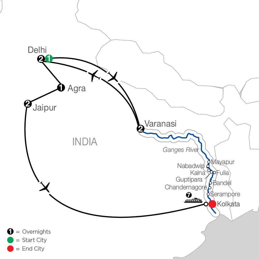 Discover a world of color, culture, and the cherished spiritual heritage of India. Your guided tour of India and Ganges River cruise begins in the bustling city of Delhi. First, travel to Varanasi, the holiest of Hindu pilgrim cities, to observe the striking Ganga Aarti (spiritual worship) on the ghats (steps) leading down to the sacred Ganges River. Return to Delhi and tour the city with your expert Tour Director. Take a rickshaw ride through the Chandni Chowk bazaar—brimming with everything from silver and spices to saris of every color. You’ll visit Qutub Minar—the world’s largest brick minaret and see Delhi’s largest Sikh gurudwara (house of worship), before traveling to Agra—site of the legendary Taj Mahal. You’ll encounter more stunning sights with a sunset excursion to the Taj Mahal—the iconic memorial built by Moghul emperor Shah Jahan for his beloved wife. More than 20 years in the making, the Taj Mahal stands as the pinnacle of love’s devotion, where you’ll also have the opportunity to experience this iconic site at sunrise. You’ll continue to the city of Jaipur, with its famous Palace of the Winds, and spectacular Amber Fort, before flying to Kolkata to board your cruise on the Ganges River—the holy river of Hinduism, as it slowly courses through one of the world’s most fertile and populated areas. Along its banks, human life is connected to its waters where you’ll get a glimpse of life apart from India’s big cities. From fascinating muslin weaving in Nabadwip and pottery making in Guptipara, you’ll explore the fascinating Hare Krishna headquarters in Mayapur and visit the stunning Hooghly Imambara upon your return to Kolkata. All of this and more await you on this once-in-a-lifetime guided tour of India with a Ganges River cruise.