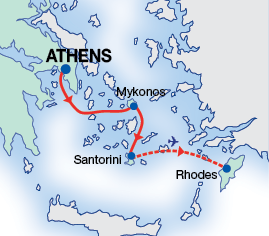 This is customized Greek Island-Hopping program for individual travelers. These short 10 days program incorporates the most famous of the Greek islands: Mykonos, Santorini and Rhodes, followed by the capital city, Athens, and is the perfect choice for first time traveler to Greece who will enjoy the local walking tour on each island. Accommodation in 4 star hotels included as well as all transfers and city tours in Athens. Mykonos, Santorini and Rhodes.