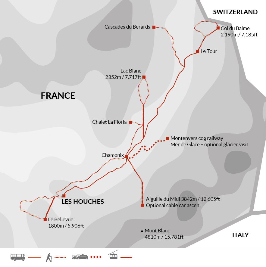 We don't include an arrival transfer on this tour but it's easy to reach our joining hotel in Les Houches independently. The easiest way to get from the airport to our hotel is via the Mountain Drop Offs shared shuttle bus service, which departs regularly from Geneva Airport throughout the day and takes just over an hour. The shuttle will drop you at the door of the hotel, tickets cost €50 and can be booked online at https://www.mountaindropoffs.com/.