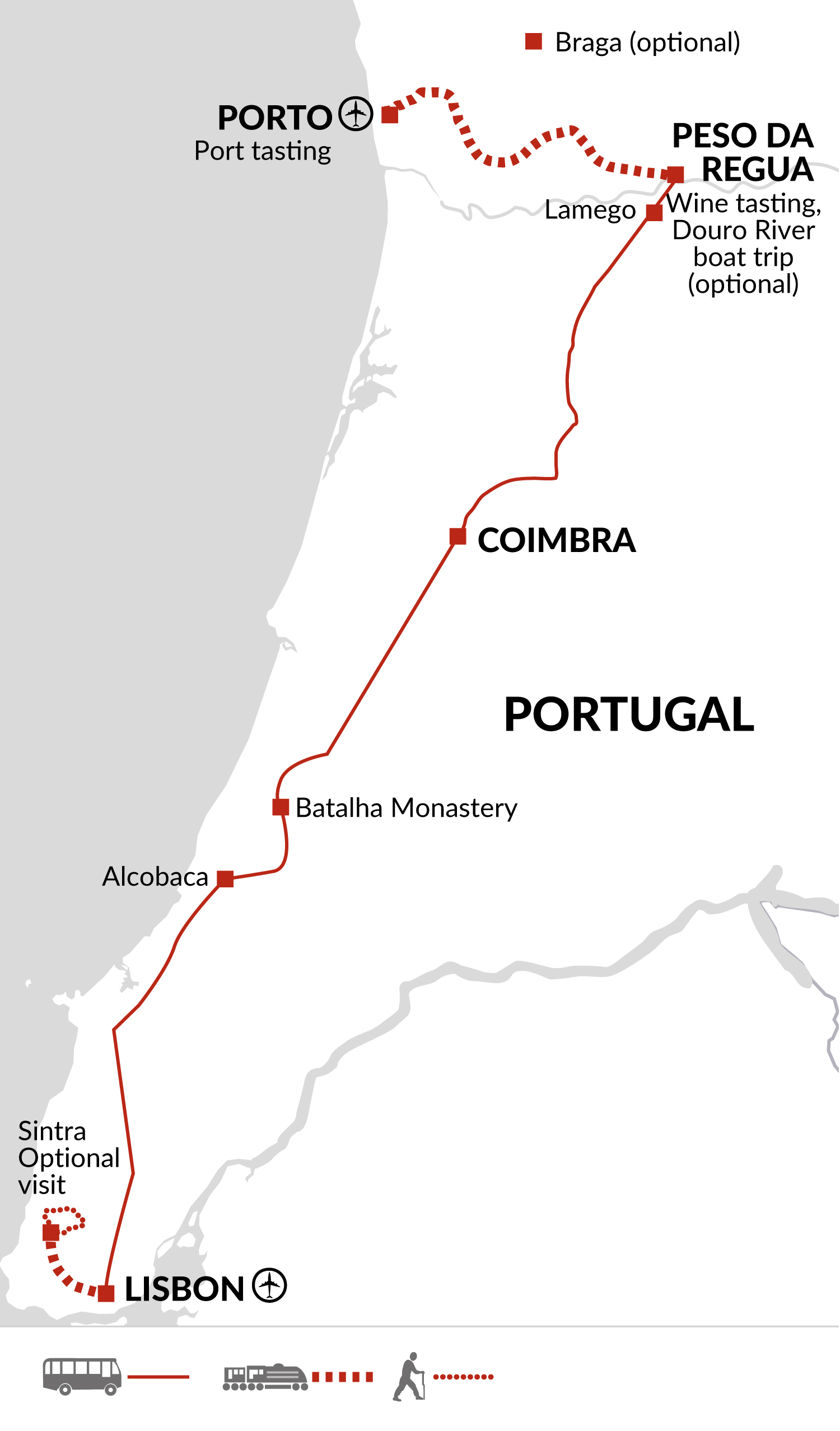 Our trip begins in Lisbon, a city built on seven hills overlooking the estuary of the River Tagus. After its conquest from the Moors in 1147, Lisbon became the capital of Portugal. As Portugal built its global empire from the 15th century onwards, Lisbon became the hub of international trade, marking the heart of the maritime Golden Age of discovery - a legacy reflected in the city's monumental architecture. A devastating earthquake and resulting tsunami almost completely destroyed the capital in 1755, and so Lisbon appears as a carefully planned 18th-century city today.