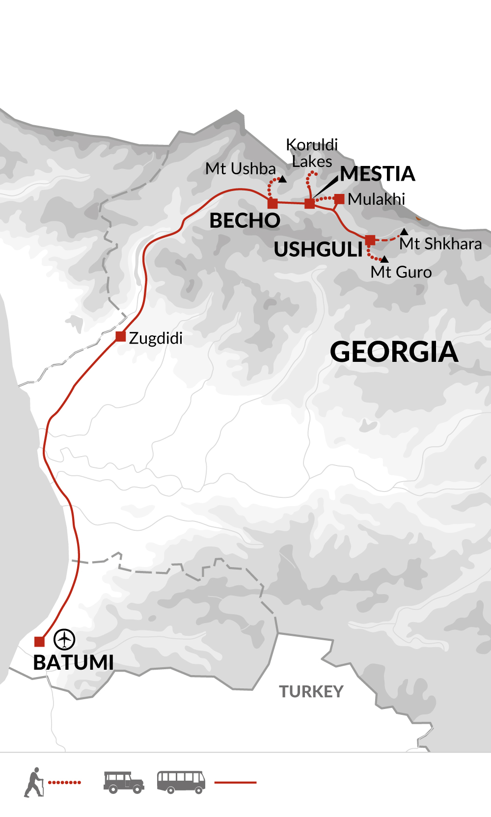 Mount Shkhara is Georgia's highest mountain, standing at 5,201 metres, it's the eastern anchor of an imposing 12 kilometre ridge known as the Bezingi Wall. Our walk to the foot of the glacier at the base of the mountain follows the course of the Enereti River back to its source along a flat trail and, for the most part, we'll be rewarded with spectacular views of the mountain. Wildflowers carpet the grassy valley and purple orchids can be seen in bloom along the banks of the river. As we reach the final approach to the glacier, the path becomes steeper and the terrain rockier. Finally, we'll reach the tongue of the glacier, with incredible views up to the craggy, snow-covered sides of Mount Shkhara. We'll return to Ushguli on the same route.