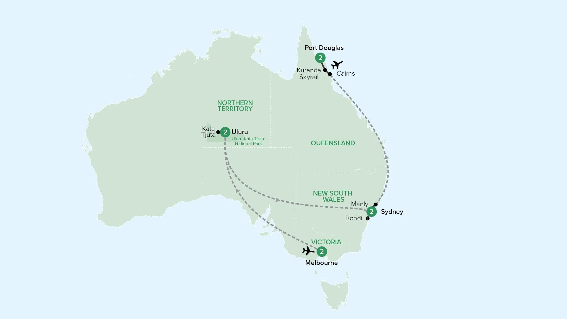 Explore the best of Melbourne, Uluru, Sydney and Cairns on this spectacular journey through Australia’s highlights. Discover the heart of Melbourne’s culture, witness the beauty of Uluru-Kata Tjuta National Park, and delve into the wilderness of Far North Queensland.