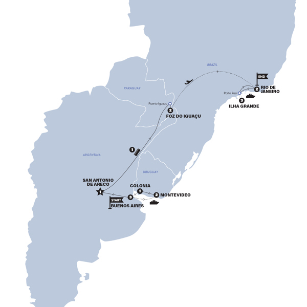 Get ready for 16 days of city buzz, slow-coast moments and headline hits, moving through hostels, ferries, transfers and overnight buses with your crew. You'll go from Buenos Aires to Uruguay’s laid-back corners in Montevideo & Colonia, dip into gaucho country in San Antonio de Areco, then crank it up at Iguazu Falls (both Argentina and Brazil sides) before finishing with Ilha Grande island time and Rio de Janeiro to close it out in style.