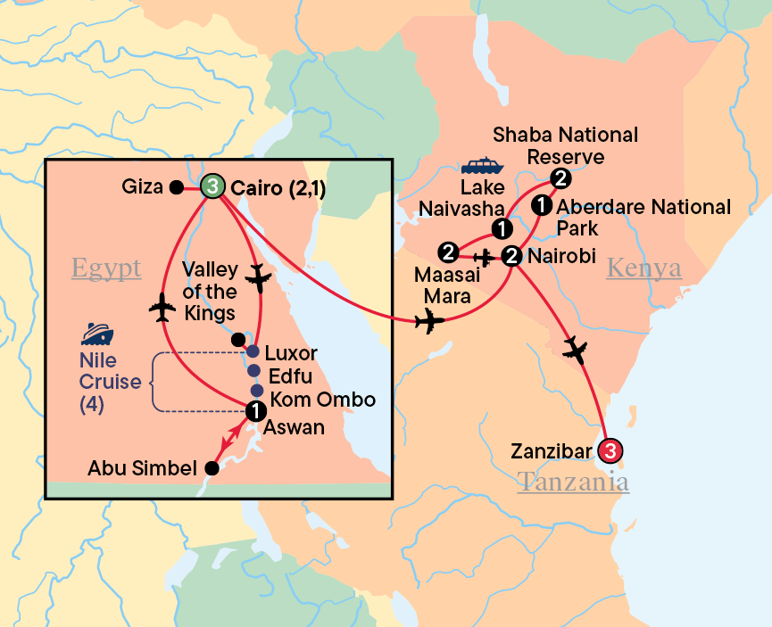 As the evening sets in, we bid farewell to Egypt as we fly to Nairobi, the capital of Kenya, on an overnight flight.