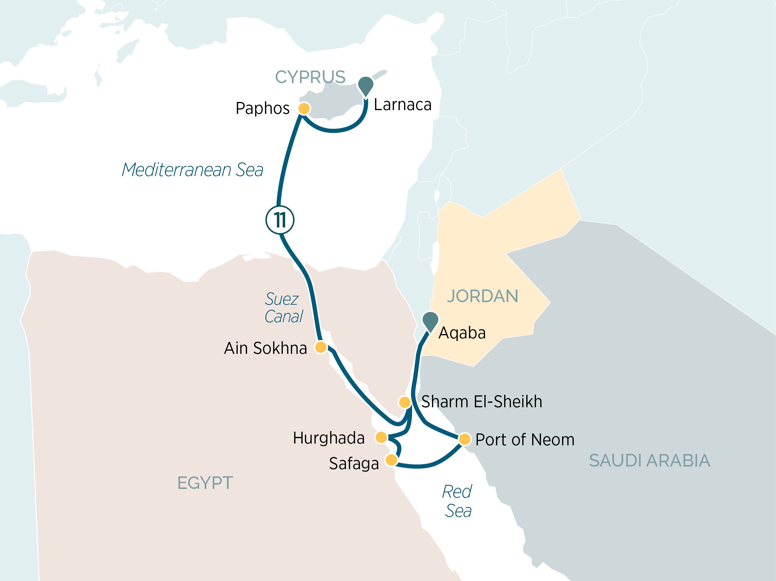 Embark on an extraordinary voyage that blends Mediterranean charm with the mystique of the Red Sea. Beginning in Cyprus with stops in Larnaca and Paphos, this itinerary leads you through the iconic Suez Canal before unveiling the spectacular destinations of Egypt’s Red Sea coast, including Sharm El Sheikh, Hurghada, and Safaga. Along the way, enjoy relaxing days at sea and explore emerging destinations like Saudi Arabia’s futuristic Port of NEOM, before concluding with the ancient wonders and dramatic desert landscapes of Aqaba, Jordan. This unforgettable cruise offers a perfect mix of cultural discovery, natural beauty, and modern adventure.