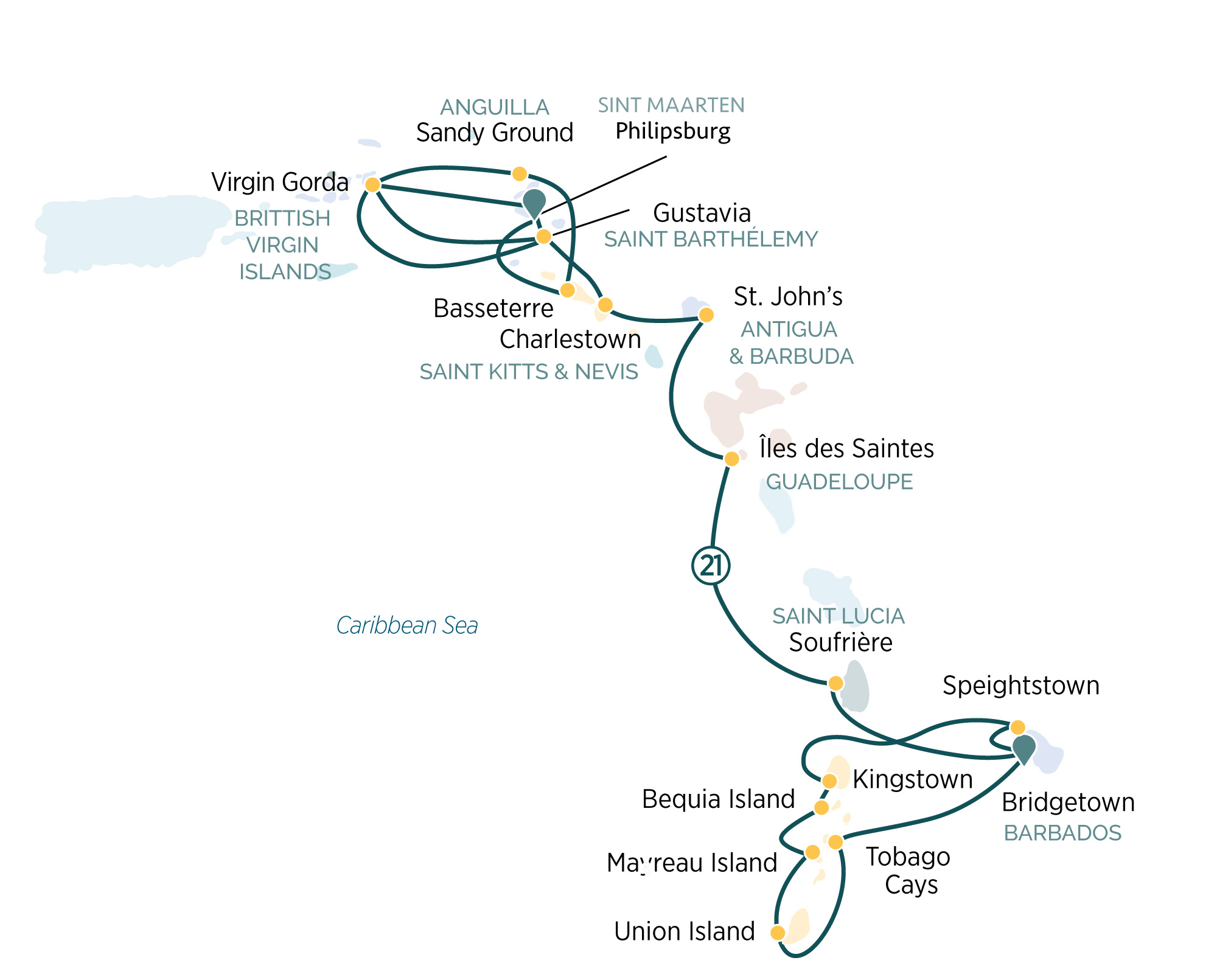 Embark on an epic 22-day Caribbean voyage on a luxury Emerald Cruises yacht. Starting in Philipsburg, Sint Marteen, this exceptional cruise navigates stunning archipelagos and immerses you in the colourful culture of the Caribbean. Snorkel in the crystal-clear waters of Anguilla, explore the volcanic rock formations of the British Virgin Islands and soak up the luxury lifestyle of Saint Barths. Sailing into the Eastern Caribbean, hop between the jewel-like archipelagos of Saint Kitts and Nevis, Antigua and Barbuda, Guadeloupe and Saint Lucia. From the distinctively British city of Bridgetown, Barbados, set out on a loop of the sparkling islands of Saint Vincent and the Grenadines. Hike lush mountains, swim in turquoise waters and settle into the laid-back Caribbean way of life.