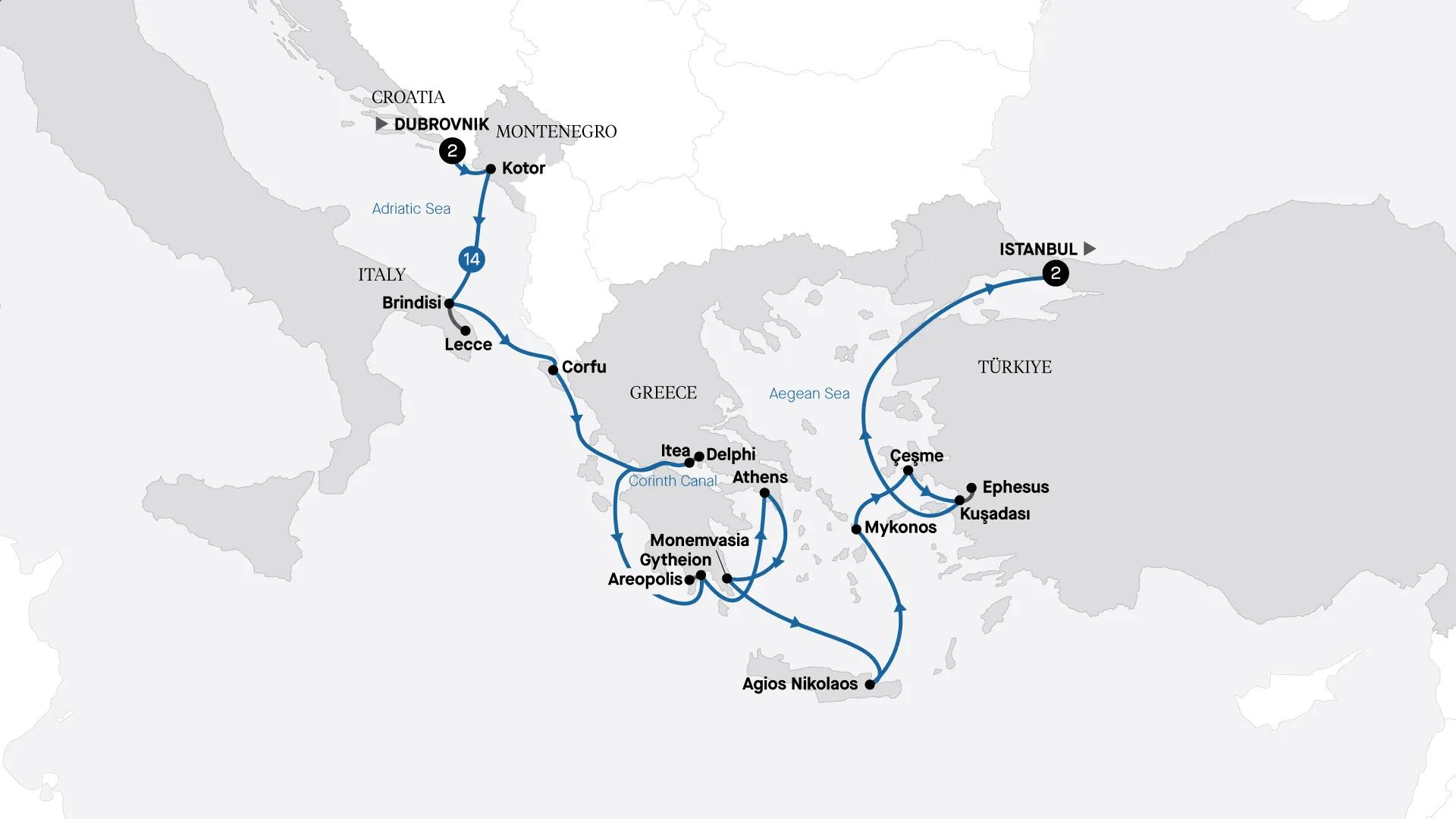 Cruise from Dubrovnik to Istanbul, uncovering the coastal jewels of the Adriatic, Ionian and Aegean seas. Commence in the glorious Croatian city of Dubrovnik, renowned for its stunningly preserved Old Town, encircled by ancient fortifications that overlook the Adriatic Sea. During your cruise, step ashore to wander the charming, cobbled streets of medieval towns and cities, and admire superbly preserved archaeological sites that reveal the legacy of ancient civilisations. Conclude your epic voyage in magnificent Istanbul, a legendary city where iconic architecture and exquisite cuisine come together in a captivating tapestry of culture.