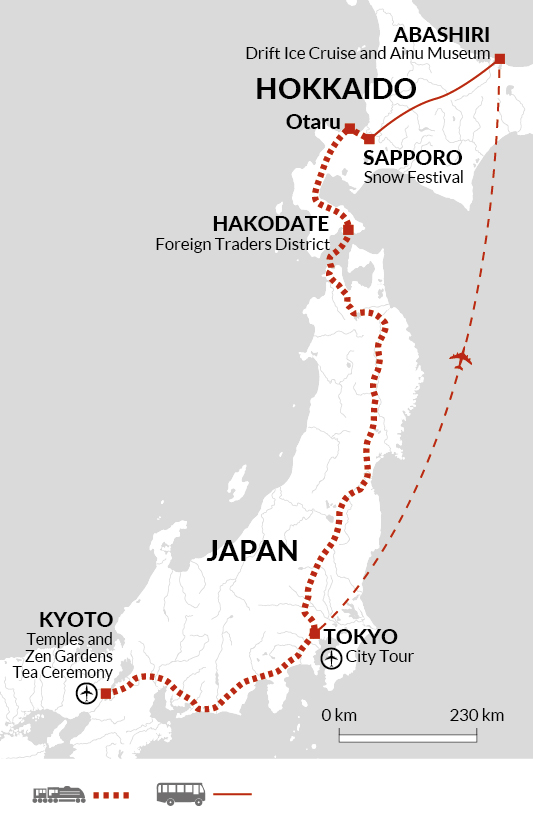 Abashiri is Japan's northernmost major city located at 44 degrees north latitude. From mid-January to late March the waters here are covered in drift ice and we will be taking a short cruise through the Sea of Okhotsk to get to the main drift ice areas. With luck, a variety of wild animals can be seen including seals and sea eagles resting on the ice. From the ship you can also sometimes spot foxes and deer on the coast. The boat ride takes about one hour in total depending on ice conditions and is shared with other passengers. We catch a local bus to the train station where we spend the afternoon travelling by train to Sapporo, a scenic route with views across the snow-covered landscape, with one change of trains along the way and arriving in the early evening.