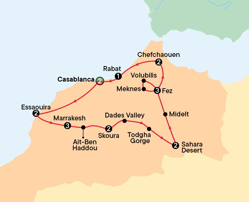 We say a warm ‘ahlan wa sahlan’ to Casablanca, Morocco’s largest and most modern city. Casablanca’s name, translating easily to ‘White House’ in Spanish was inspired by the sparkling, white-washed buildings of the Old Medina. It’s the perfect starting point for our adventure through the sights and sounds of this lively country.