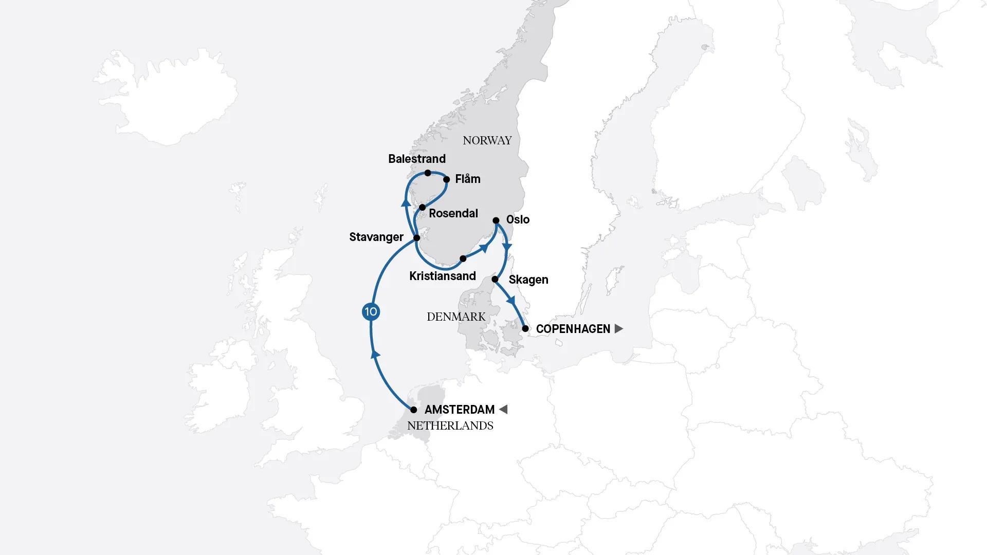 Sail from the canals of Amsterdam to the colourful harbours of Copenhagen on an unforgettable voyage through Northern Europe. Cross the North Sea to Norway’s dramatic fjord country, where sheer cliffs, tumbling waterfalls and glassy waters frame storybook villages like Flåm and Balestrand. Discover Stavanger’s maritime heritage, stroll Rosendal’s rose-scented streets, and soak up the culture of Oslo. Along Denmark’s coast, wander the golden beaches of Skagen before your journey concludes in Copenhagen, a city of cobbled streets, royal palaces and cutting-edge design. From historic ports to breathtaking natural wonders, each day brings a new perspective on Scandinavia’s coastal beauty.
