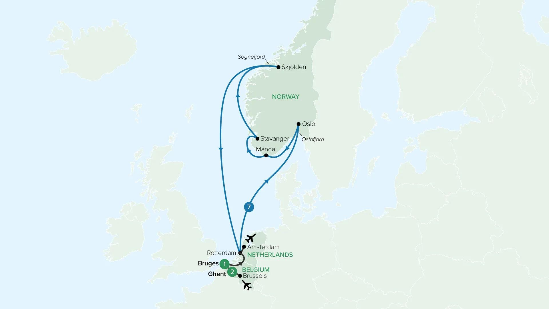 Journey through Europe with time in Belgium’s most atmospheric cities before setting sail for Scandinavia. Explore Ghent’s medieval streets and canals, then discover storybook Bruges and the iconic windmills of Kinderdijk. Board a Holland America Line cruise to Norway, where coastal towns, historic ports and dramatic fjords unfold, from Oslofjord and Stavanger to the glacier-carved landscapes of Sognefjord and Skjolden.