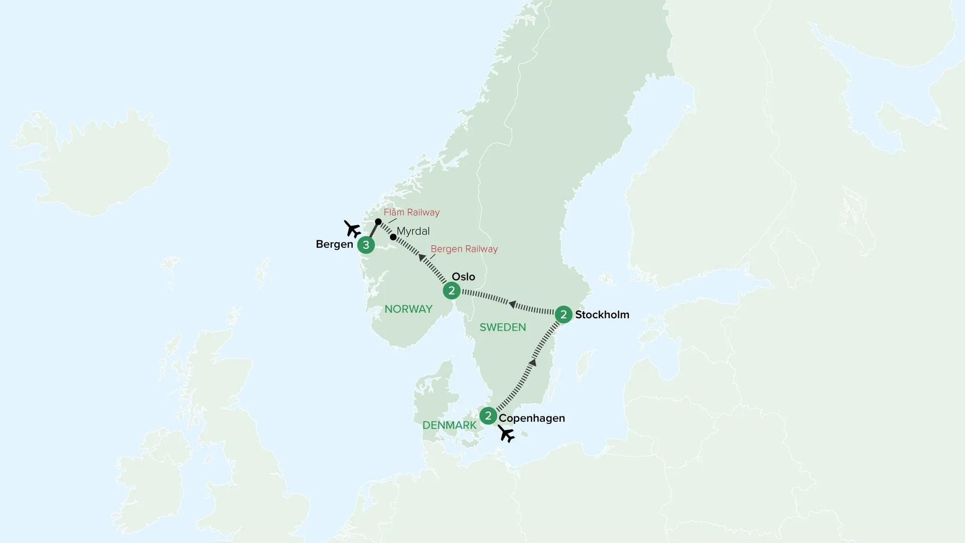Experience Scandinavia by rail on a journey linking Copenhagen, Stockholm and Oslo with Norway’s dramatic fjord country. Travel aboard iconic routes including the Bergen and Flåm railways, crossing mountain plateaus, deep valleys and waterfall-lined landscapes. This rail adventure reveals the beauty of Denmark, Sweden and Norway at a relaxed, immersive pace, echoing the timeless romance of traditional travel.