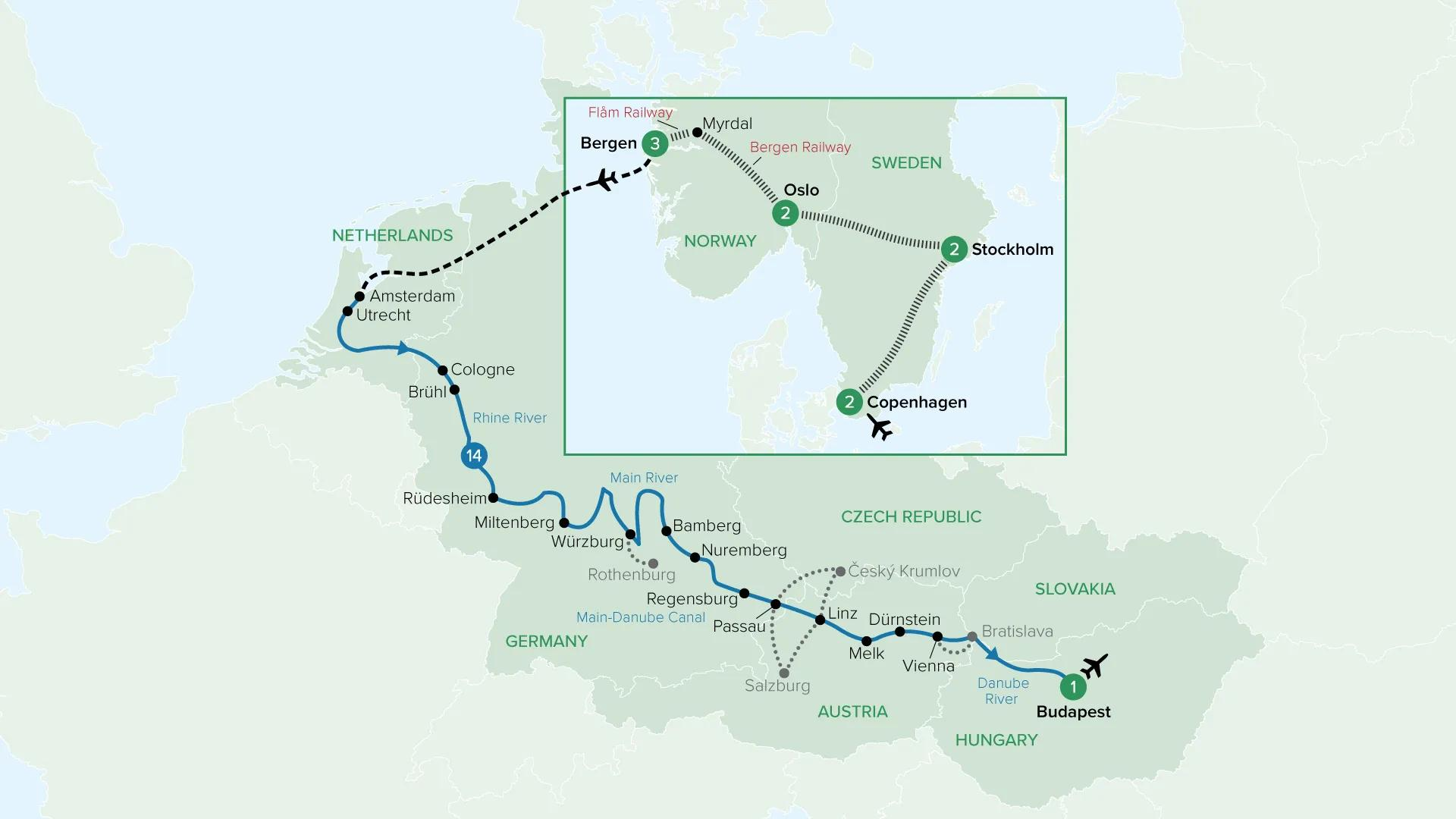 From Scandinavia’s stylish capitals to the grand waterways of Central Europe, this epic journey blends rail and river travel. Discover Copenhagen, Stockholm, Oslo and Bergen, including the spectacular Flåm Railway, before cruising the Rhine, Main and Danube rivers through medieval towns and imperial cities.