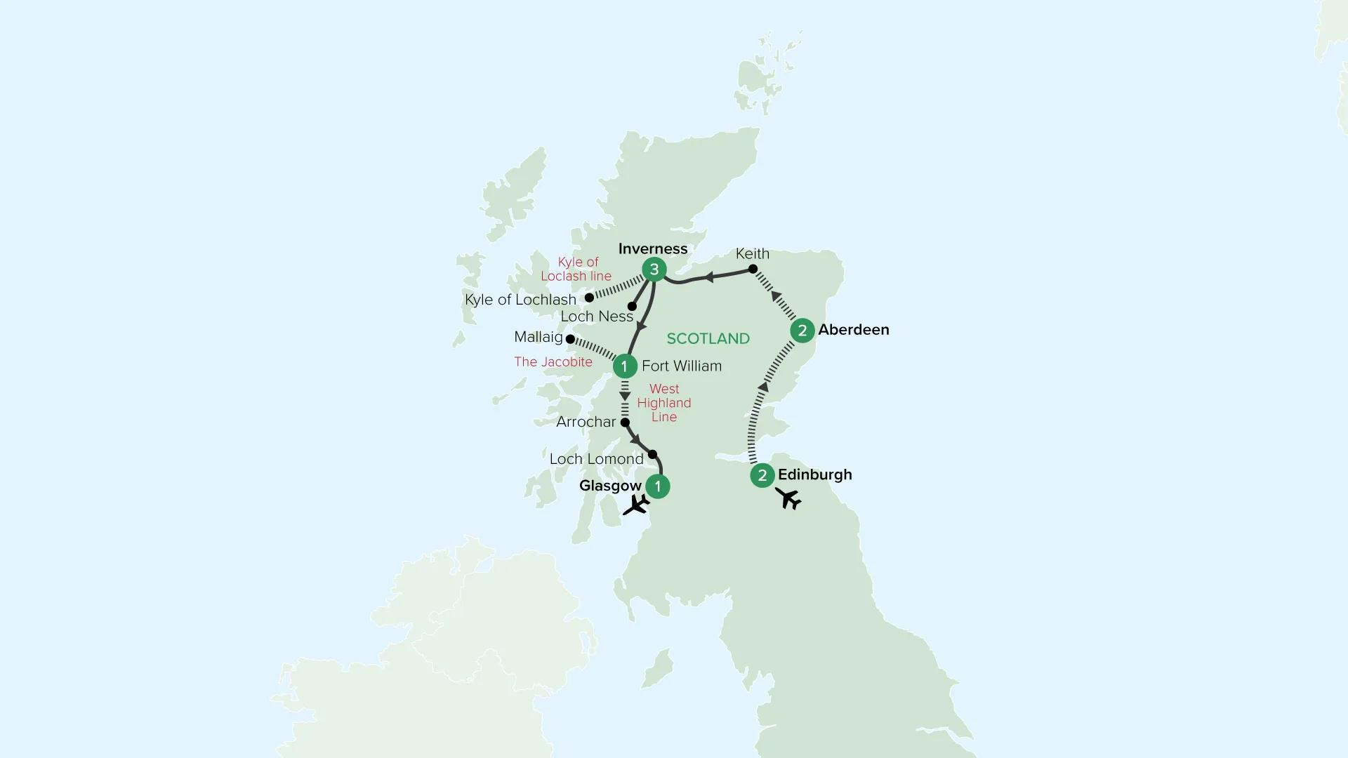 Discover Scotland by rail on a journey linking its historic cities with the wild beauty of the Highlands. From Edinburgh’s Royal Mile and castle to the granite streets of Aberdeen, travel in a small group of no more than 24 guests into Royal Deeside and Speyside’s whisky country, cruise Loch Ness and ride iconic routes including the Kyle Line, the West Highland Line and the Jacobite Steam Train to Mallaig. Along the way explore Highland towns and enjoy authentic local experiences, offering an immersive introduction to Scotland’s landscapes and culture.