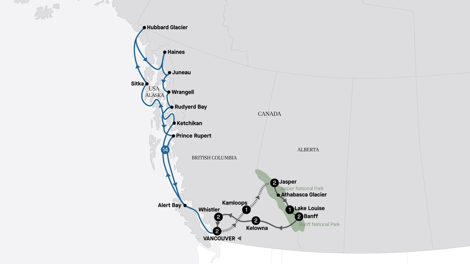 Discover Canada's breathtaking Rocky Mountains on a Small Group Tour, including a captivating luxury rail journey aboard the renowned Rocky Mountaineer in GoldLeaf Service. Experience the splendour of Jasper National Park, meet First Nations Warrior Women, and gaze in awe at the shimmering turquoise waters of Lake Louise. Then, embark on a 14-night cruise of Alaska's legendary Inside Passage, enjoying the region's spectacular natural scenery, wildlife, and visiting iconic destinations including Juneau and Hubbard Glacier — an unforgettable adventure of this stunning region of North America.
