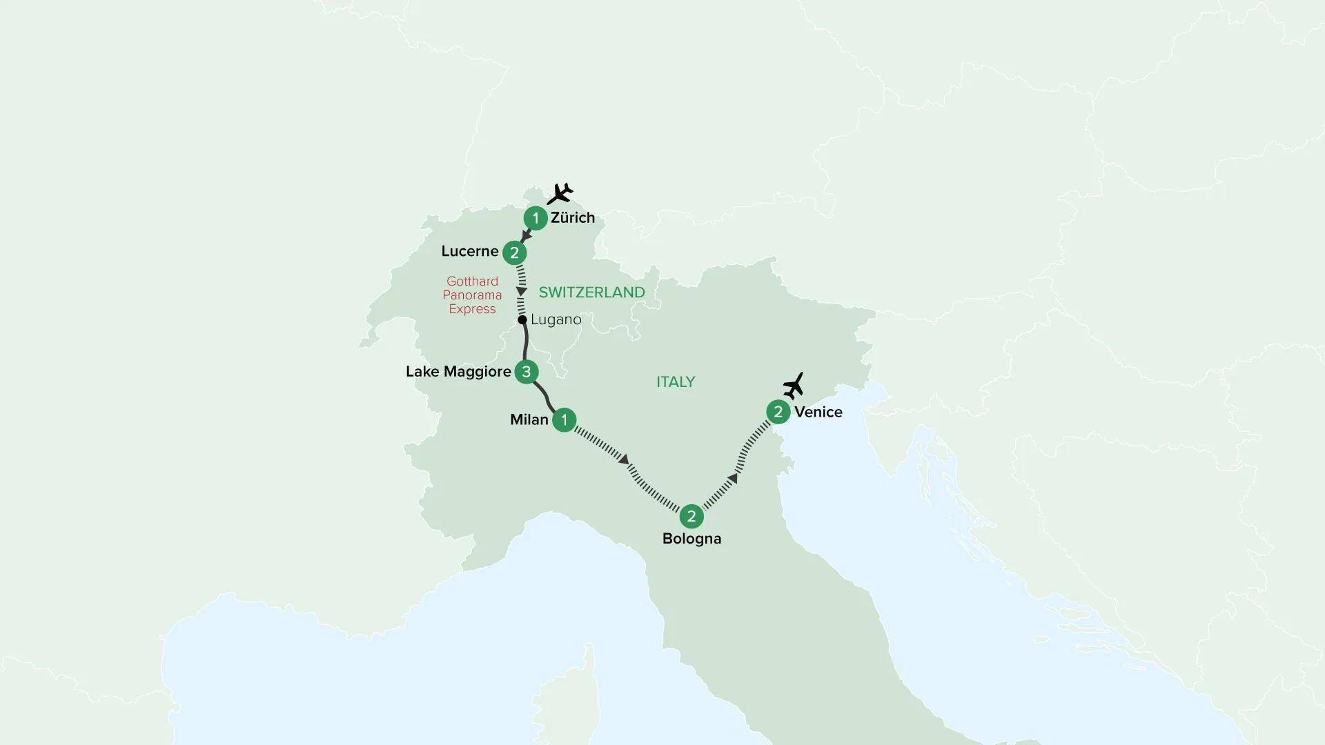 Journey from the Swiss Alps to northern Italy on small group tour that blends scenic rail travel, lakeside stays and cultural discovery. Travelling with no more than 24 guests, spend time in Zurich and Lucerne, admire alpine views and the Italian Lakes around Stresa, then continue to Milan, Bologna and romantic Venice. With exclusive experiences balanced by time to explore at your own pace, this tour offers an enriching introduction to the landscapes, flavours and traditions of Switzerland and Italy.