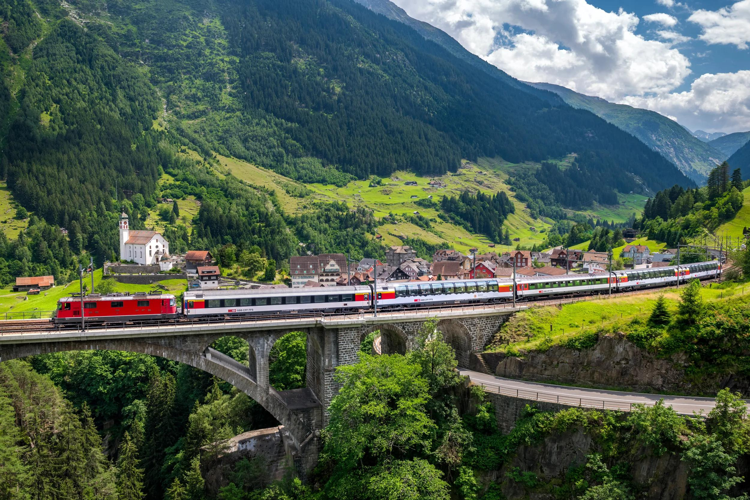 Travel aboard the Gotthard Panorama Express by First Class panoramic train, tracing the historic Gotthard route through alpine valleys, dramatic gorges and spiral tunnels. Large windows reveal waterfalls, mountain villages and soaring peaks as you wind through one of Switzerland’s most scenic rail corridors.