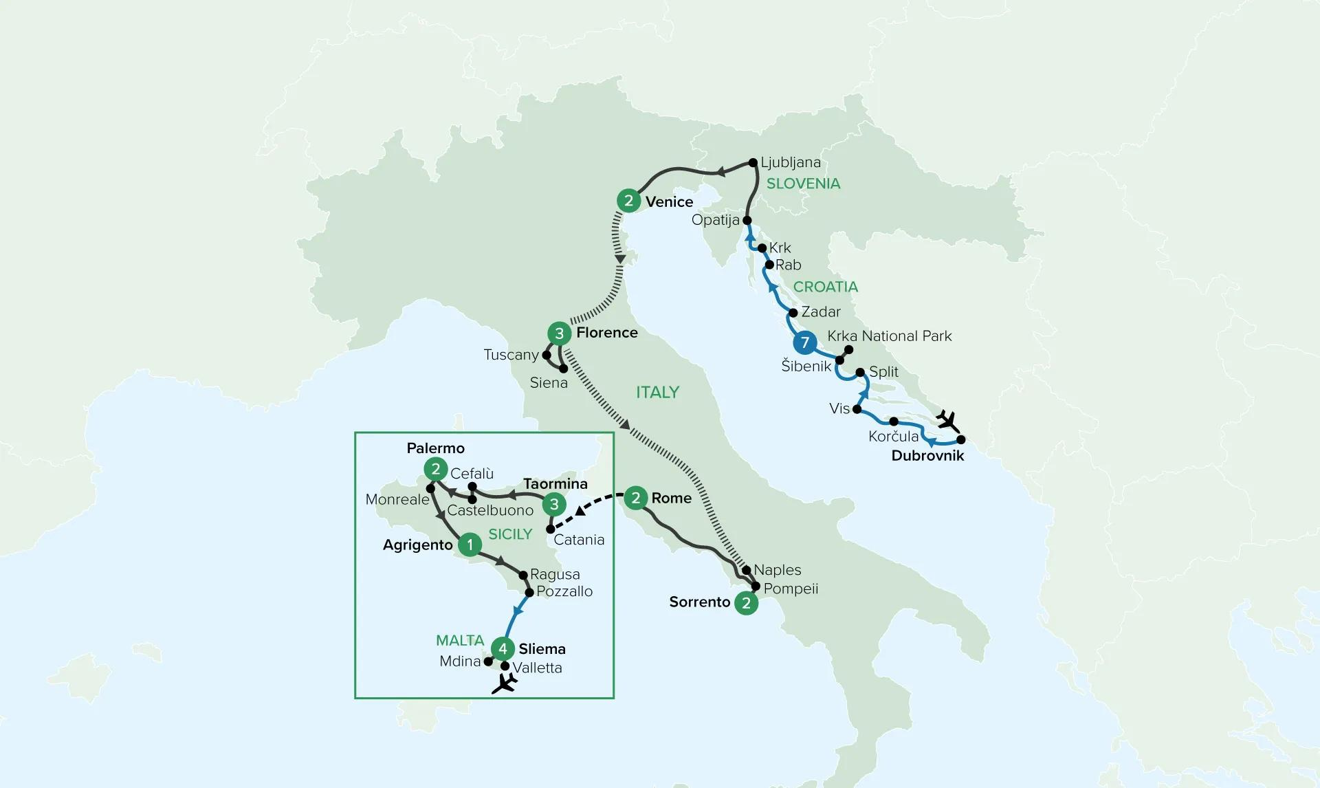 Discover the rich cultures of southern Europe on a small group tour through Italy, Sicily and Malta, complemented by a cruise along the Adriatic coast. Wander Venice’s canals, explore Renaissance Florence and ancient Rome, and uncover the ruins of Pompeii before soaking up the charm of Sorrento. Continue to Sicily’s dramatic landscapes and historic towns, then experience Malta’s fortified cities and Mediterranean heritage. Along the way, sail the Adriatic, visiting coastal gems and island ports that reveal another side of this captivating region.