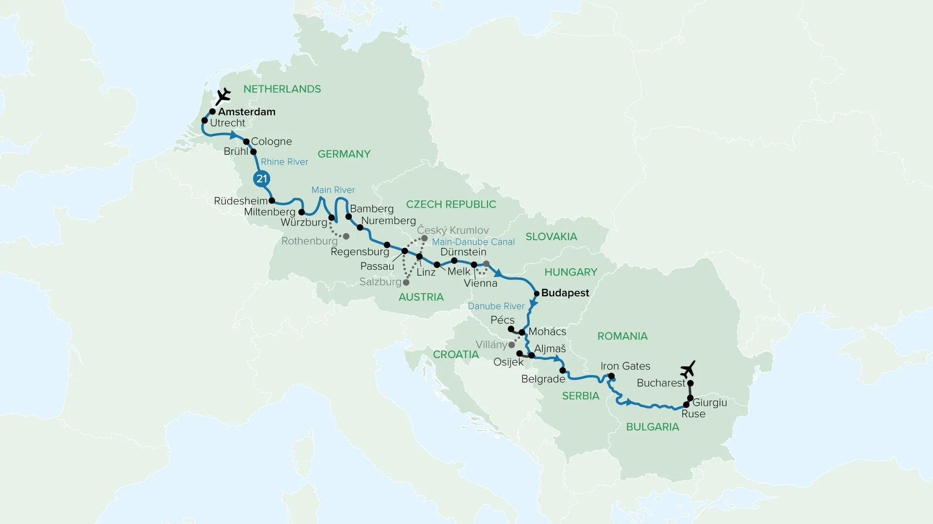 Sail deep into the heart of Europe on an epic 21-night river cruise from Amsterdam to Bucharest. Begin among Amsterdam’s canals before tracing the Rhine and Main rivers past Cologne, the Rhine Gorge and medieval towns such as Rüdesheim and Miltenberg. Continue through Bavaria to Austria’s Wachau Valley and Vienna, then linger in Budapest before venturing beyond the traditional Danube routes into Croatia, Serbia, Bulgaria and Romania. Explore grand capitals, baroque abbeys and World Heritage towns, meet local families in rural villages, and cruise the dramatic Iron Gates gorge.