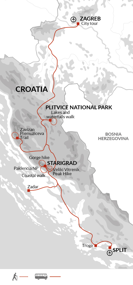 This walking holiday explores Croatia's national parks; the jagged peaks of Dalmatia, plunging gorges in Paklenica and spectacular lakes and waterfalls in Plitvice. Stay in the capital Zagreb and in coastal Spilt meander the maze of cobbled streets past ancient sites.
