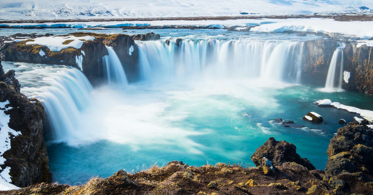 We'll leave the mountains behind and spend the afternoon discovering Iceland's waterfalls. Starting with Godafoss, known as 'the waterfall of the gods', it's particularly spectacular in winter when the clear blue waters partially freeze.