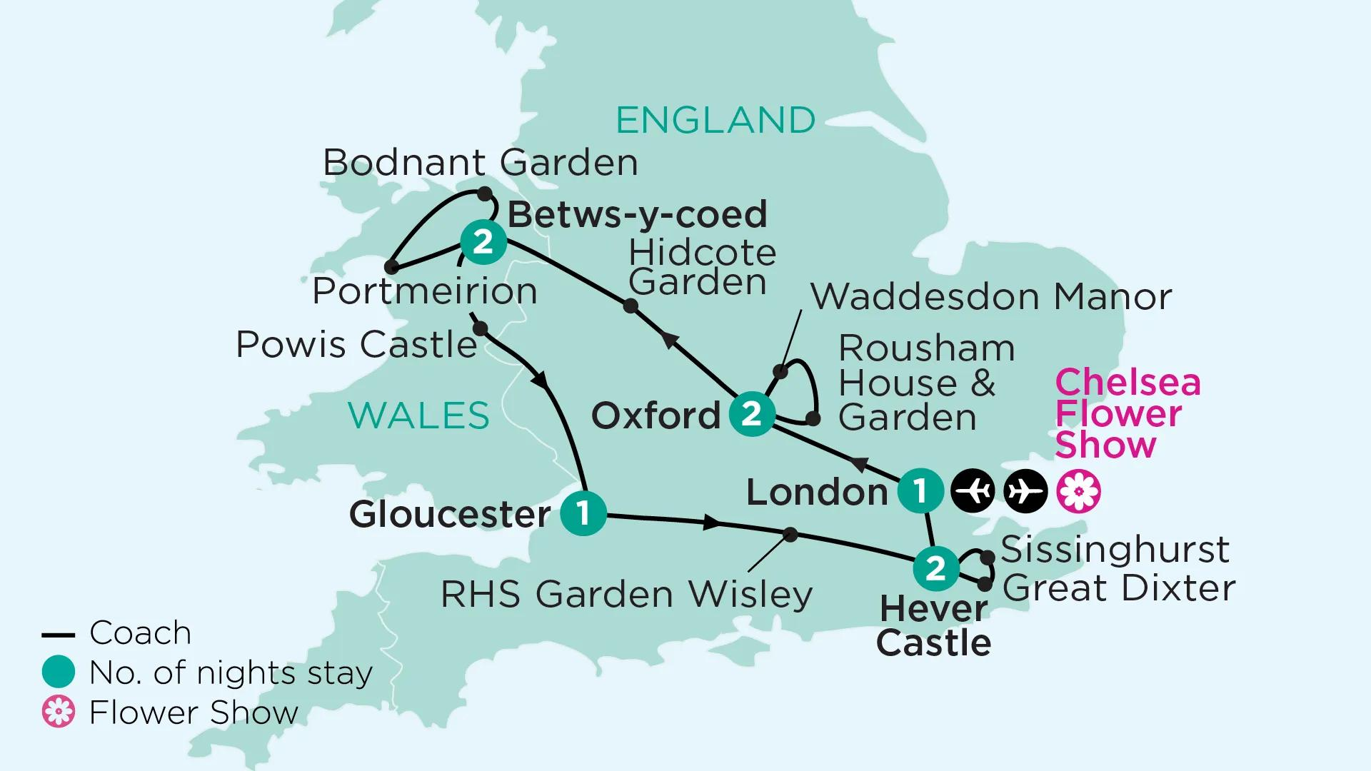 The ideal tour for those wishing to discover the famed gardens of England and Wales. Enter the grounds of the celebrated Chelsea Flower Show before the crowds and see the exhibits with your Botanical Guide. Learn what goes into an award-winning garden during a special presentation by a leading garden designer. Stay two nights in the historic Hever Castle of Anne Boleyn fame. Visit Bodnant Garden, Great Dixter, Sissinghurst, Hidcote, and Kew Gardens. These enchanting gardens will be in full bloom during our spring travels.