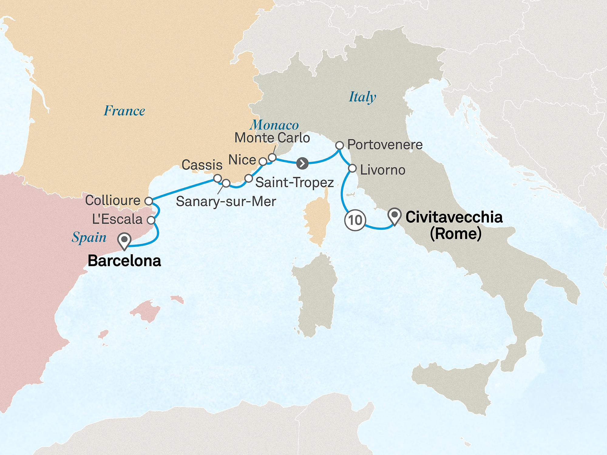Set sail from vibrant Barcelona on a Mediterranean voyage defined by timeless charm, coastal elegance and immersive moments. With overnight stays in Monte Carlo and Sanary-sur-Mer, and late departures from Saint-Tropez and beyond, you’ll have rare opportunities to experience each destination long after the day crowds depart. From golden-hour strolls through Provençal villages to evenings beneath Riviera skies, this is the Mediterranean at its most magical.