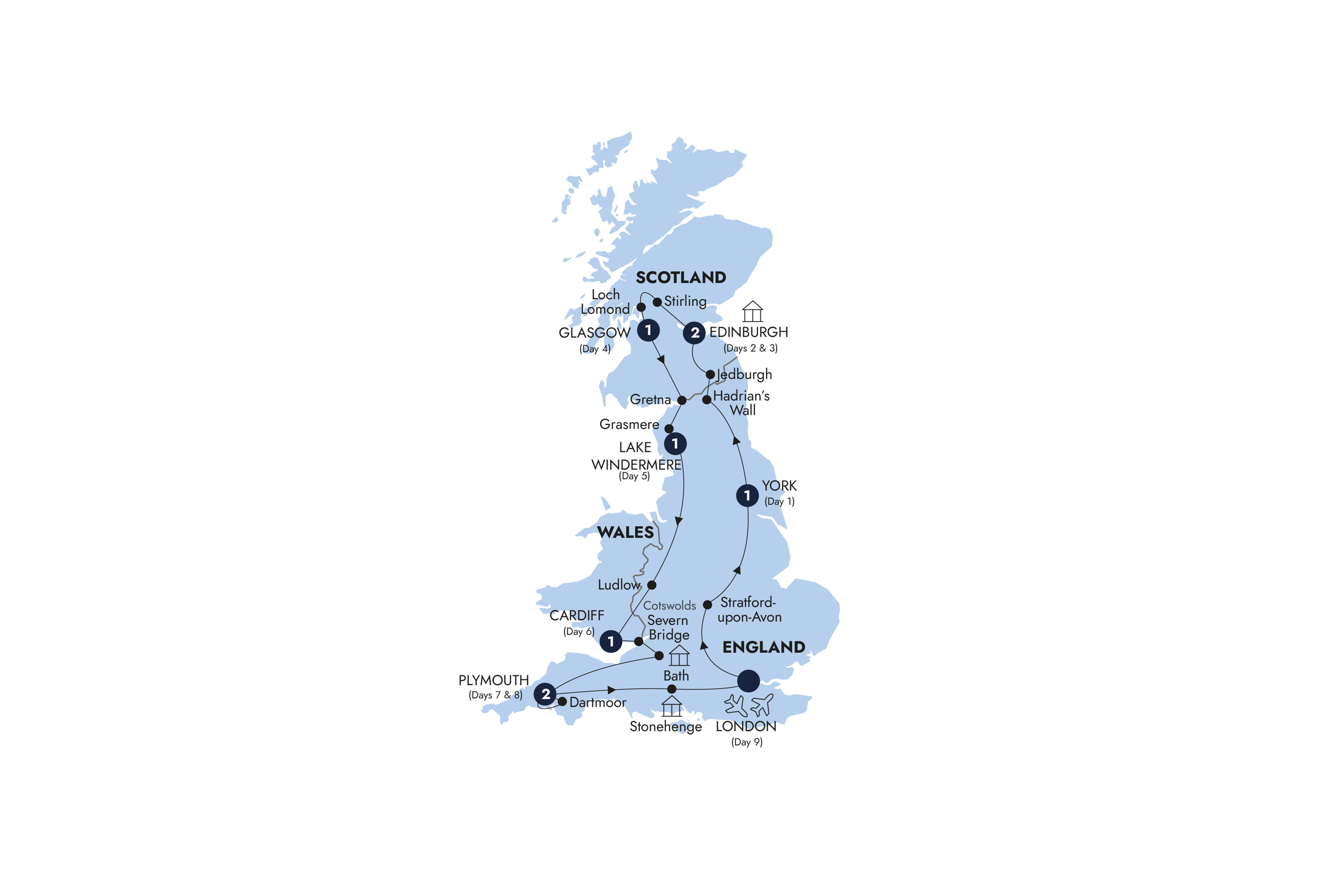See the very best of Britain on this 9-day guided tour that traverses Scotland, Wales and England. At Edinburgh Castle, sit on the Stone of Destiny, the sandstone seat upon which dozens of Scottish monarchs were crowned. Survey the English Lake District, where mountainous peaks give way to expansive lakes and scenery so picturesque it inspired the words of William Wordsworth. Plus, discover the mystery of Stonehenge, where towering prehistoric stones cast shadows on emerald green fields and sail across Plymouth harbor, with views of the city's royal citadel. Finally, indulge in a feast at a historic mill in the English countryside, enjoying organic seasonal produce freshly picked from the fields just outside.