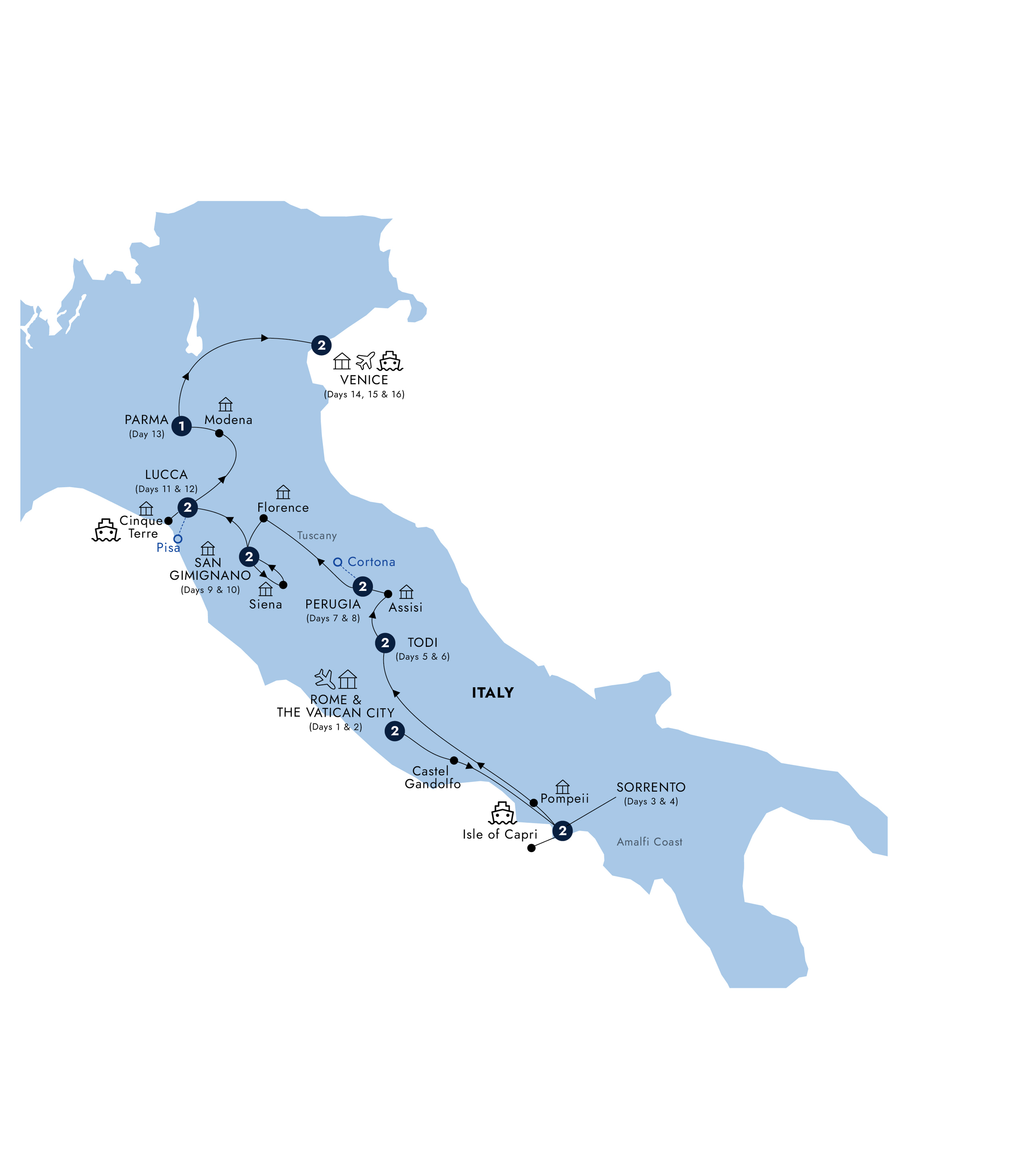 Journey across the Italian peninsula in this 16-day guided tour that stretches from the sapphire waters of the Amalfi Coast to the calming canals of Venice. Step in the footsteps of Romans from ancient times and the present day buzzing city before reaching Sorrento. Sail to the rock Isle of Capri, where you can climb nearly 2,000 feet for unrivalled views of the Tyrrhenian Sea. In Perugia, learn the art of loom-weaving from a Local Expert. And in Venice, cruise along the canals and to Burano, an idyllic, colourful island in the Venetian Lagoon where you’ll toast to a fantastic trip and indulge in local specialities.