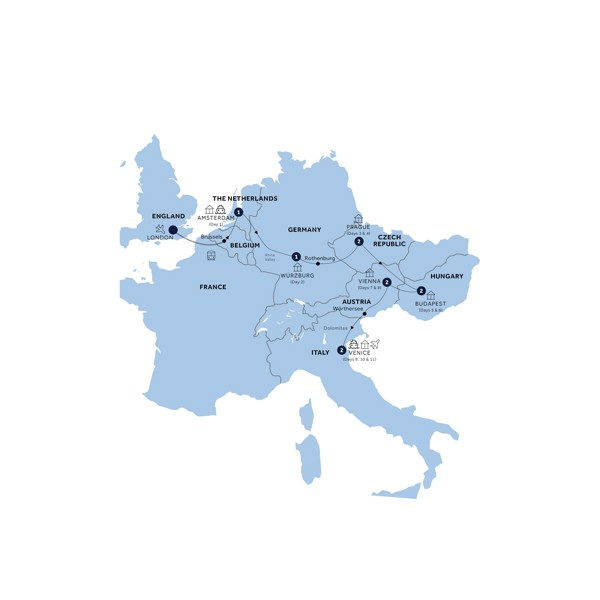 Experience the finest Europe has to offer as you lose yourself on the Romantic Road in Rothenburg and satisfy your appetite in Hungary with a delightful dinner cruise in Budapest. Led by local experts, your experience will rival the aristocrats of yesteryear in the famed Carinthian Lake District. After checking in at your exclusive, private boat access hotel, dinner is served at La Fenice before twilight night caps at Cafe Florian—the premier cocktail bar in Venice. Sample a little pomp and circumstance with the Bavarian grandeur of Germany's Würzburg Residenz and in Vienna, tread in the footsteps of your local Travel Director with a chance to take a private tour of Maria Theresa's awesome Schönbrunn Palace.