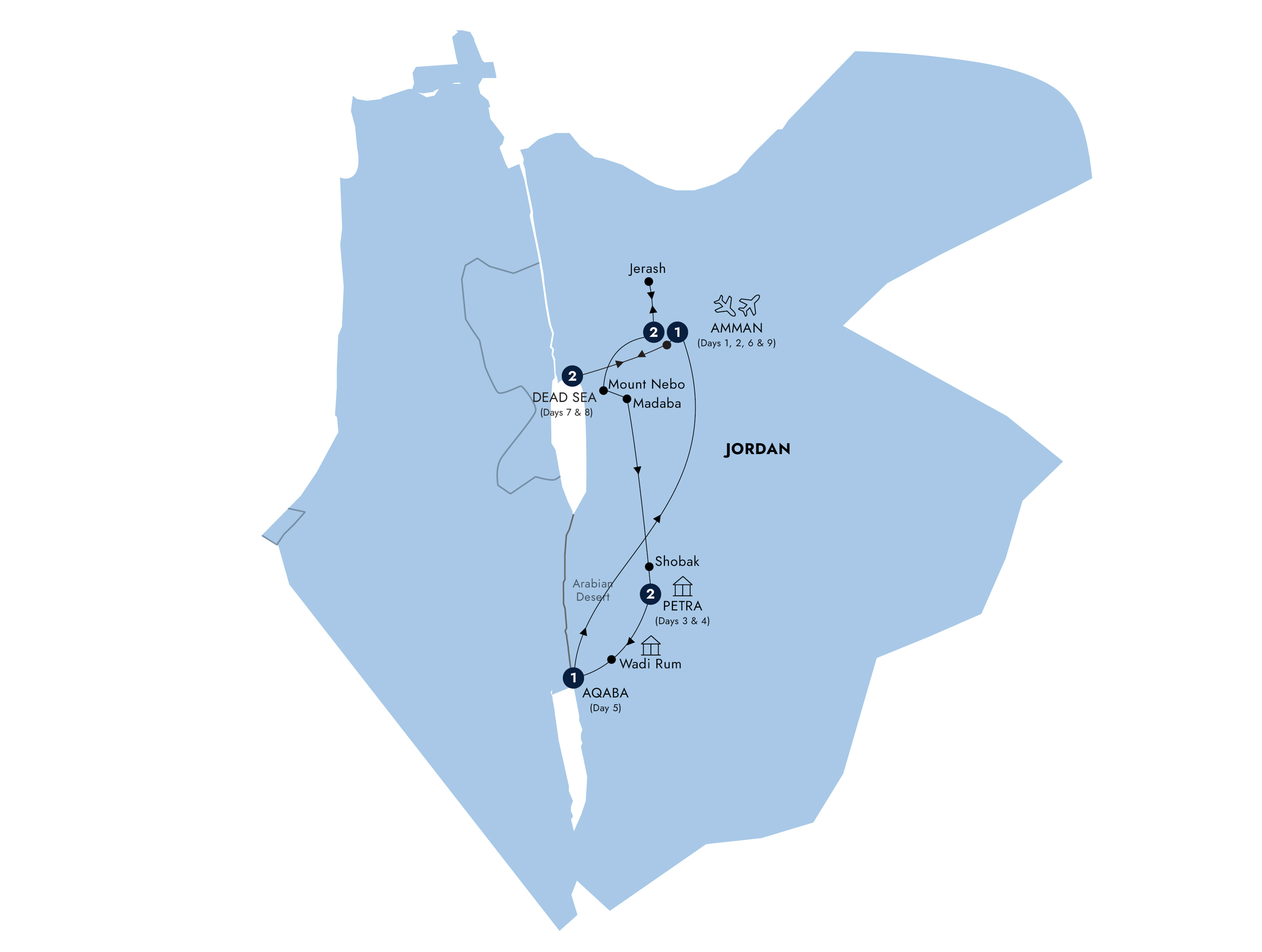 Delight in all the desert offers during this 9-day guided tour. Journey to Jerash, a short jaunt from Amman, to see the Greco-Roman city up close: Explore the ruins of the Temples of Artemis and Zeus. Ascend to one of the holiest sites in Jordan, the 11,929 feet tall Mount Nebo, where Moses once stood to see the Promised Land. Walk through the secret passages of the 12th-century fortress of Shobak and survey the desert that surrounds you. Travel to the UNESCO World Heritage Site of Petra, a city carved from red rocks and lost in time: Traverse a gorge to the city’s Treasury, an ornate tomb, and through a canyon to its Roman Amphitheatre, which once seated thousands of spectators. Back in Amman, enjoy a city tour that leads you to the ruins of Citadel Hill, with spectacular views of the city below or take a guided street-art tour and see the incredible graffiti. Spend two days relaxing by the Dead Sea.
