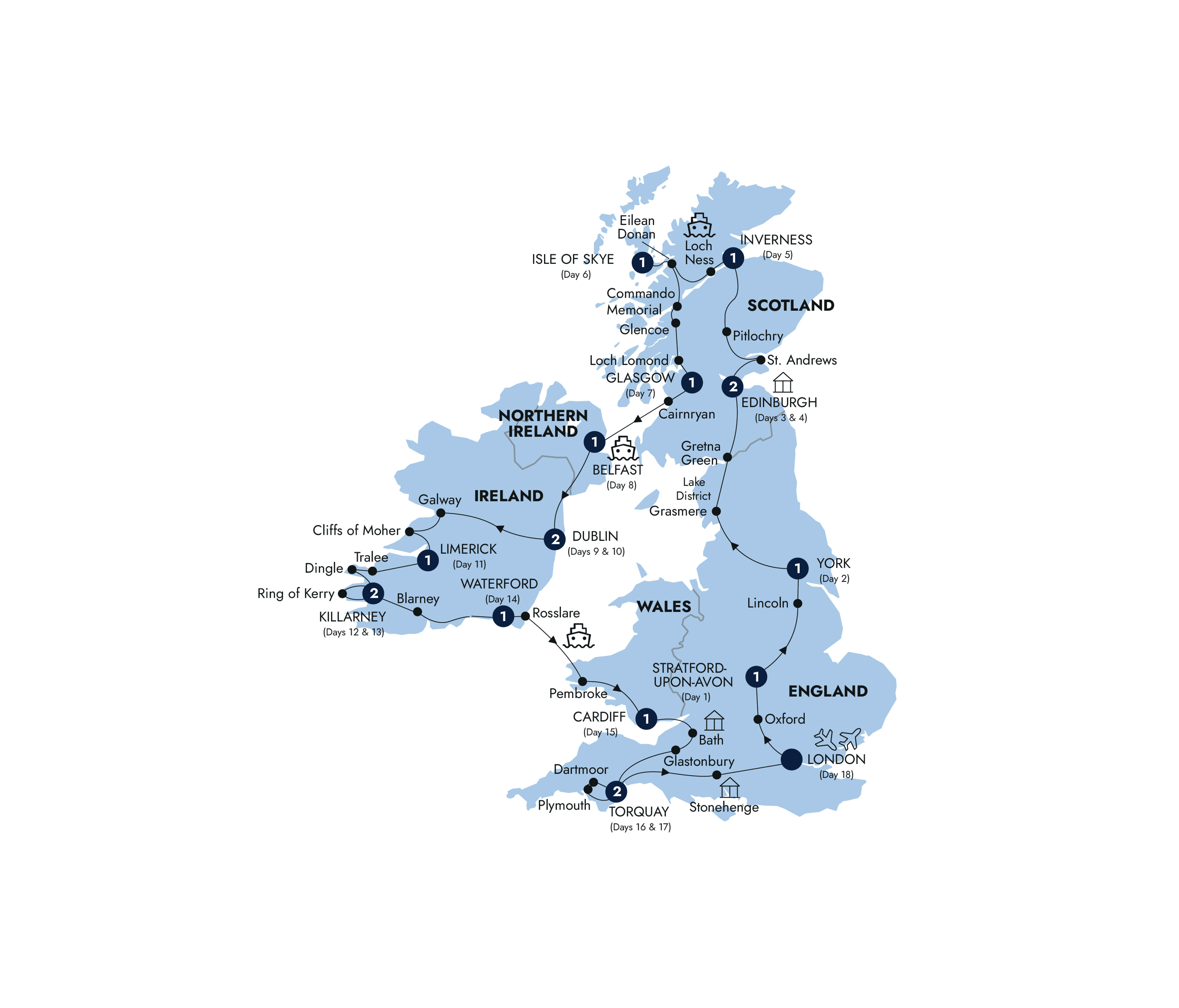 Nurture your soul on this romantic tour of Oxford’s cobbled alleyways, Edinburgh’s Royal Mile and Dublin’s Guinness Storehouse. Spanning the stunning Lake District, Britain’s yesteryear Viking capital of York, Shakespeare’s birthplace in Stratford and William Wordsworth’s home village of Grasmere, this three week tour has it all. In Ireland, the lofty Cliffs of Moher offer truly stunning vistas, while the Dine Around in Killarney experience serves up a traditional Sunday roast dinner—with all the trimmings. The journey through the Ring of Kerry boasts breathtaking views of mountains fading into the distant sea and after a stop at the famous kissing stone in Blarney Castle, Local Experts add some extra sparkle with a personal tour through the House of Waterford Crystal.