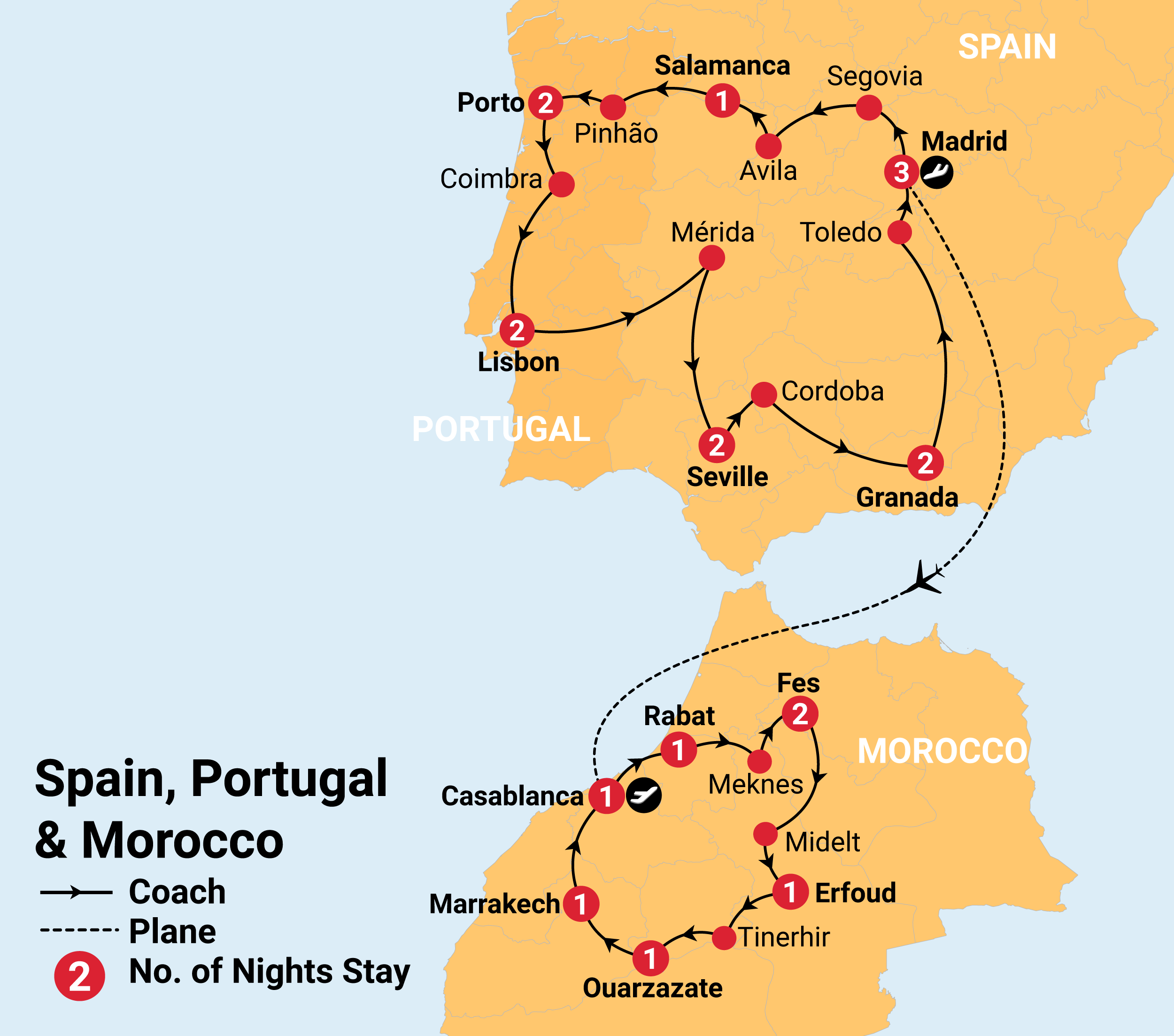 On your departure from Spain you will say goodbye to your tour guide, and your group will be met by a new tour leader in Morocco, who will meet and greet you, coordinate your activities in town and be reachable to assist you as needed.Your internal flight for this day is arranged by our local partner. Specific flight details will be provided by your Tour Leader upon arrival and cannot be provided in advance. Please note that these group flights cannot be upgraded, amended, or checked in online. Your Tour Leader will manage the check-in process for the group.