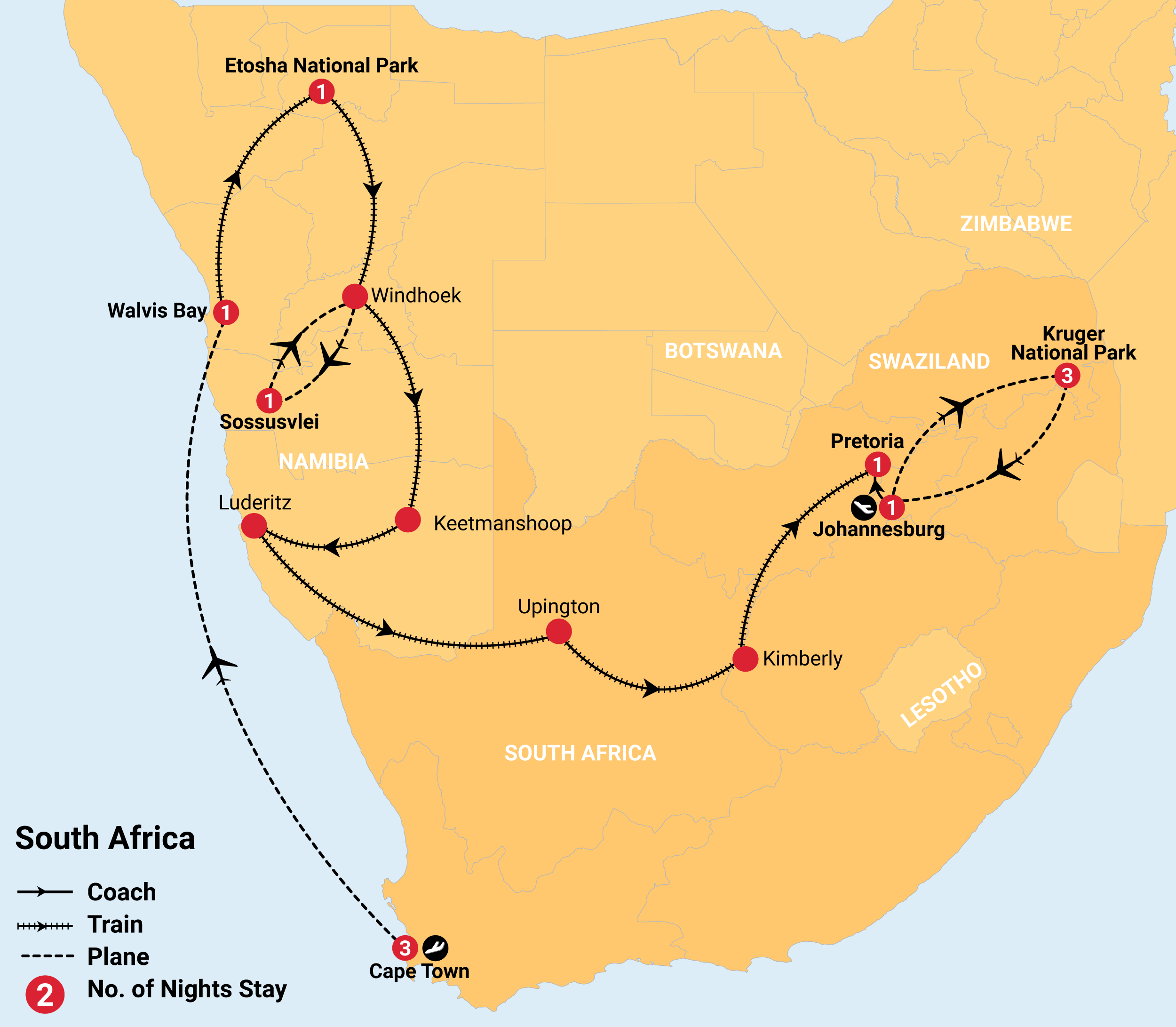 - Internal domestic flight from Cape Town to Walvis Bay, Johannesburg to Kruger & Kruger to Johannesburg