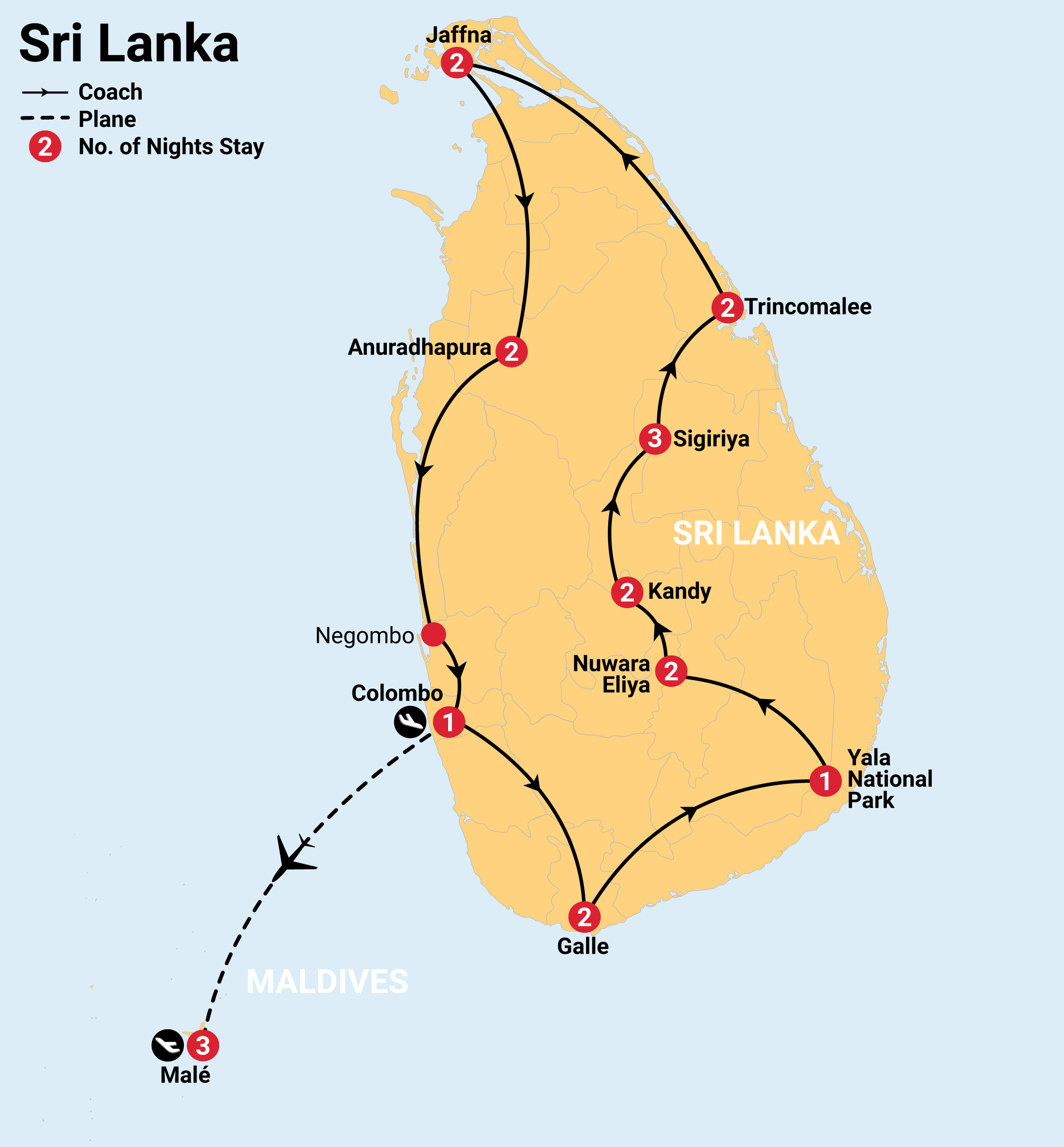 After breakfast, we drive 170 km to Bandaranaike International Airport (CMB) to board your flight to Malé
