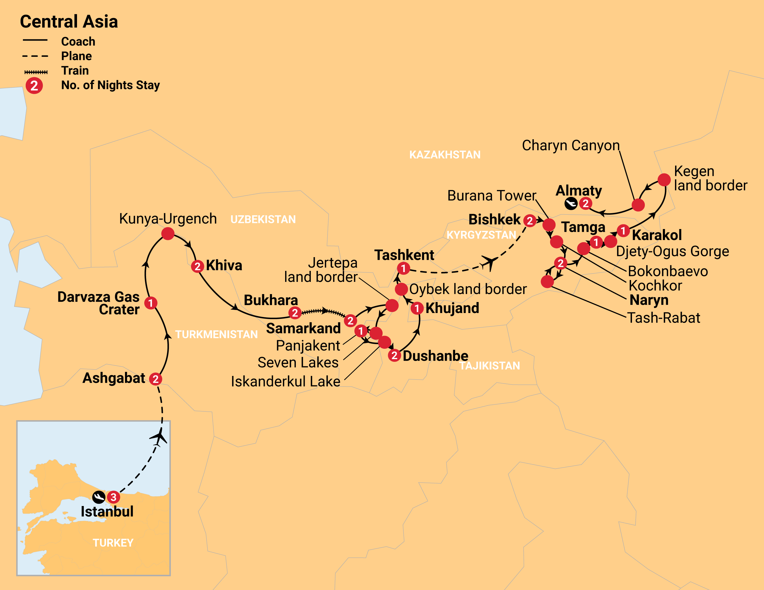 - Explore the famous 5 Stans of Central Asia: Turkmenistan, Uzbekistan, Tajikistan, Kyrgyzstan and Kazakhstan