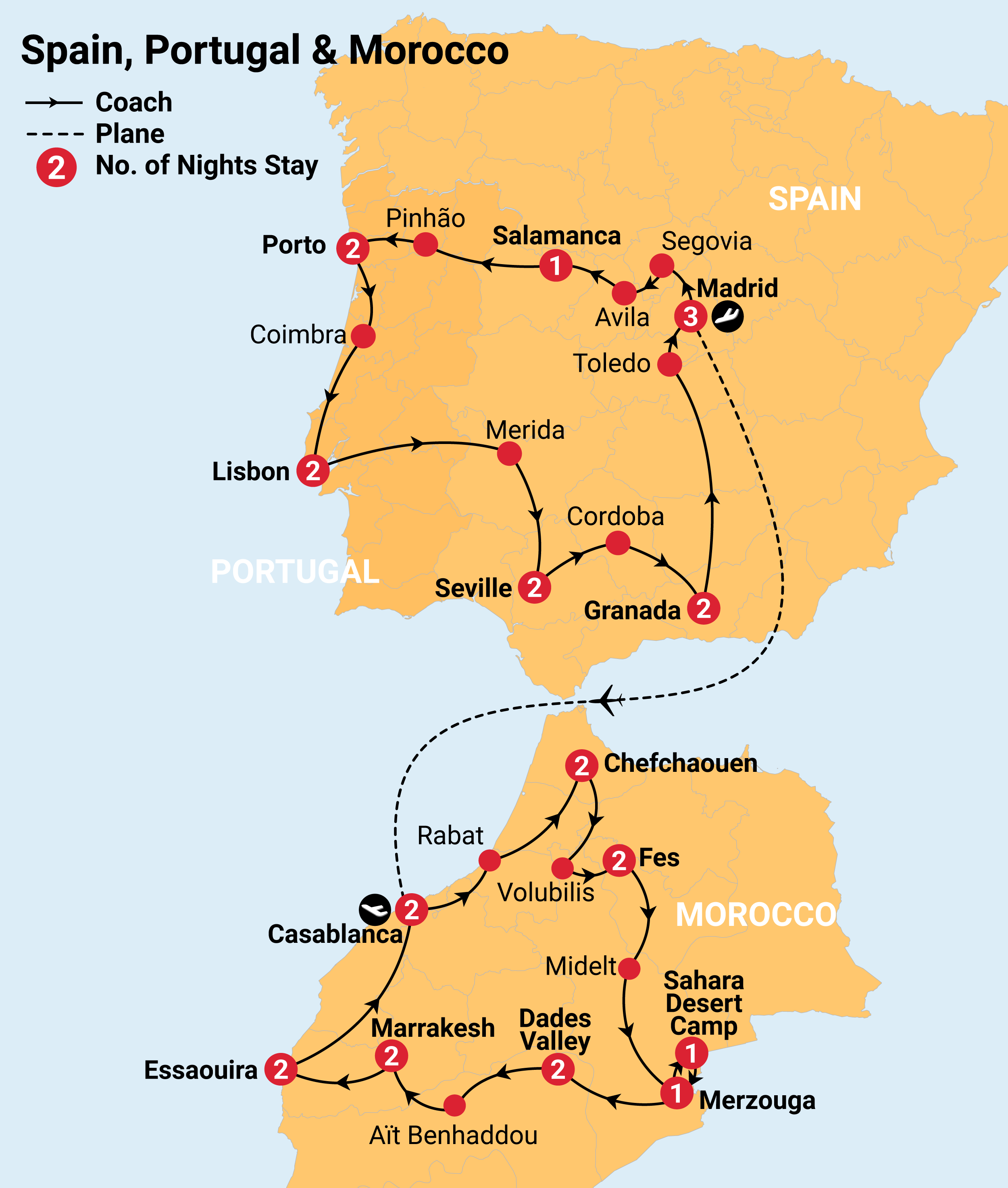 On your departure from Spain you will say goodbye to your tour guide, and your group will be met by a new tour leader in Morocco, who will meet and greet you, coordinate your activities in town and be reachable to assist you as needed.