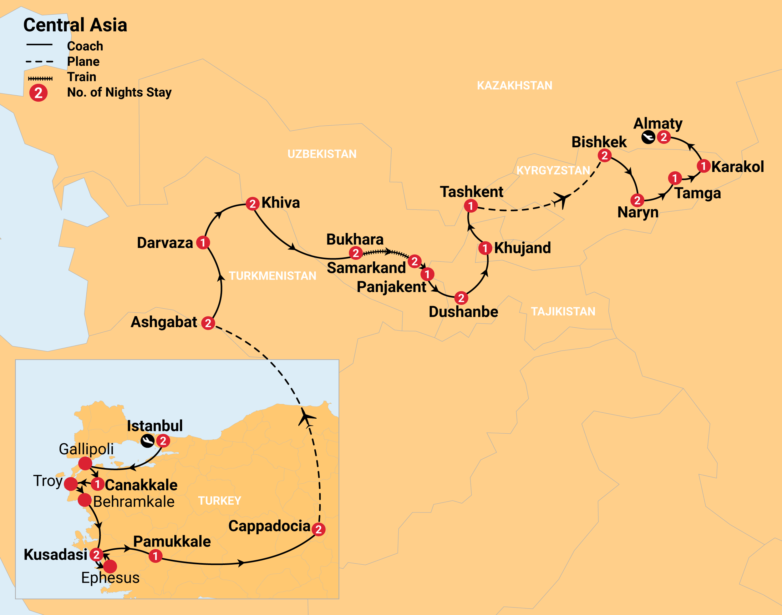 Due to local regulations in Turkmenistan, a maximum of one night pre-tour accommodation is available in Ashgabat.