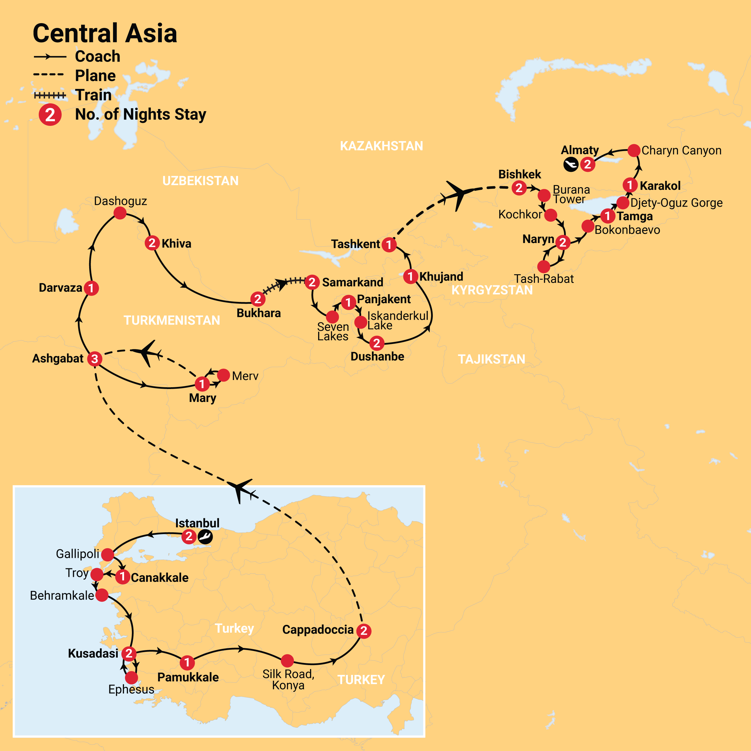 Due to local regulations in Turkmenistan, a maximum of one night pre-tour accommodation is available in Ashgabat. Arranging your own accommodation is prohibited, you must have all arrangements booked with Inspiring Vacations to avoid denied entry