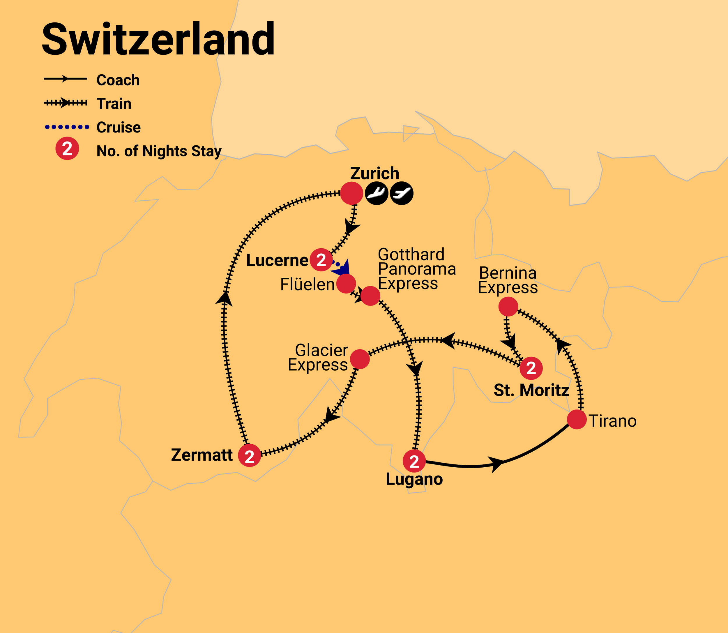 Please note: If you choose to add pre-tour accommodation to your Inspiring Vacations package, it will be in Zurich. In this case, your Swiss Half Fare Card will be valid on arrival and can be used for the train from Zurich Airport to Zurich.