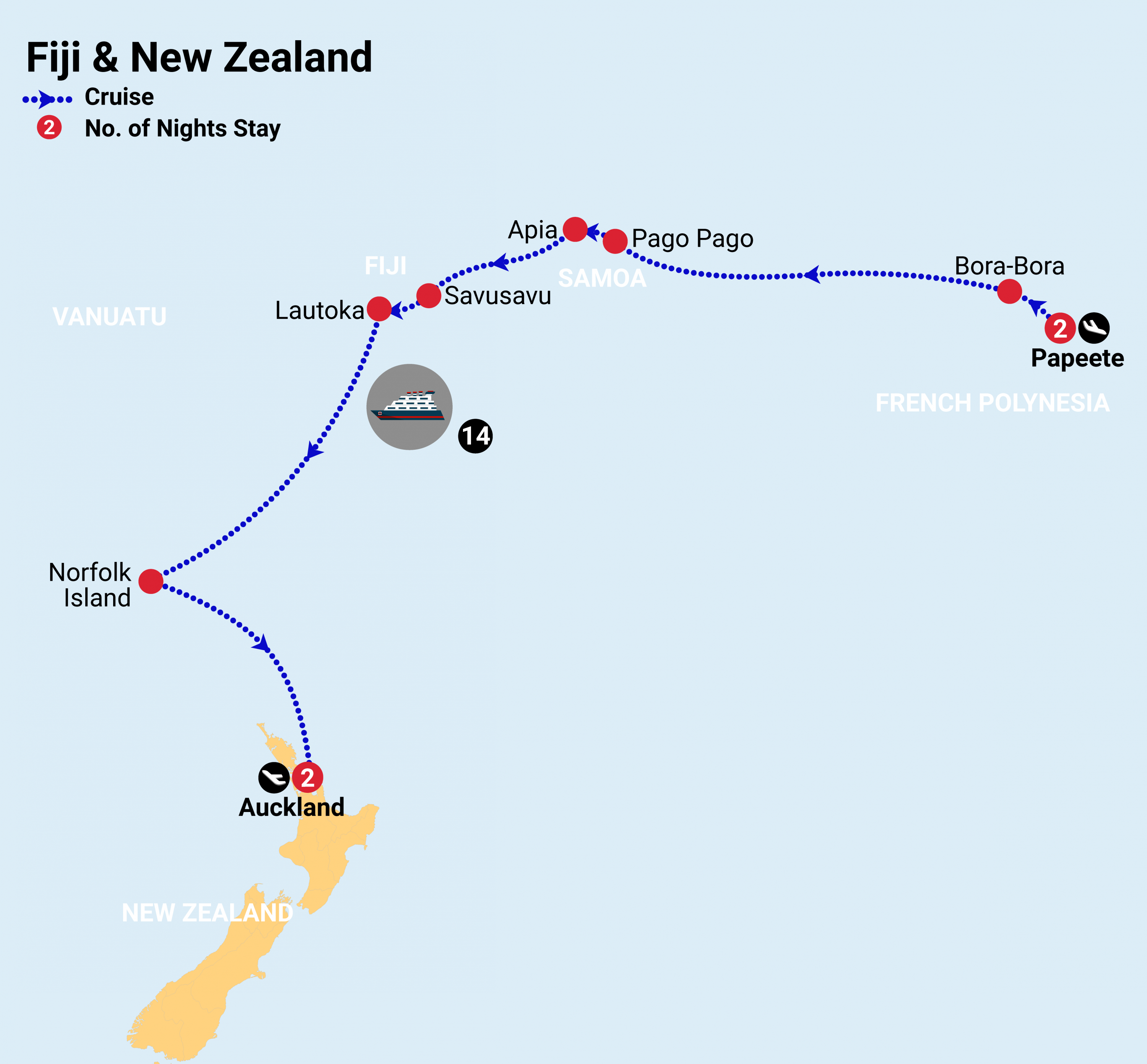 After breakfast at the hotel, your South Pacific adventure comes to an end. You may have some free time this morning to enjoy a final stroll through Auckland before making your way to the airport for your return flight home. From the tropical lagoons of Bora Bora and the islands of Fiji and Samoa to the harbour city of Auckland, this has been a journey through some of the most beautiful destinations in the South Pacific. We hope you have had a wonderful experience and look forward to welcoming you on your next adventure. Safe travels home!