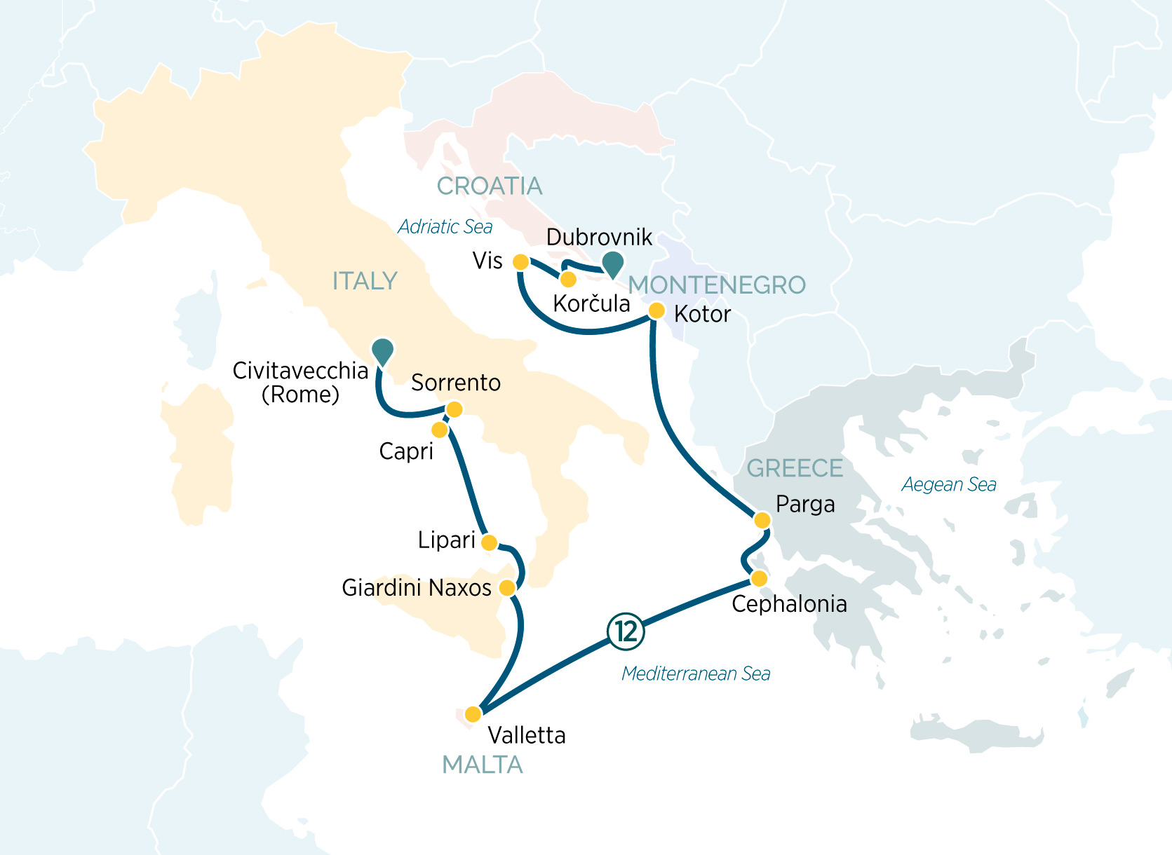 Your journey begins in Italy and historic seaport, Civitavecchia gateway to Rome, the ‘Eternal City’ and Italian capital. Then set a course for Italy’s fabled Amalfi Coast, the Bay of Naples and Island of Capri, captivating with their dramatic cliffs, quaint villages and sparkling turquoise waters. From here, admire the volcanic landscapes of the Lipari archipelago, the Sicilian hilltop town of Taormina and the Baroque-era architectural gems of the Maltese capital, Valletta.