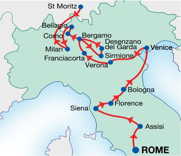 Uncover the magic of Italy on this 12-day journey that blends iconic cities, historic treasures, and stunning landscapes. Start in Rome, where ancient ruins and vibrant streets welcome you with open arms, followed by a deep dive into the Colosseum and Roman Forum. Journey north through the medieval beauty of Assisi and Siena to the Renaissance heart of Florence, then on to the culinary capital of Bologna and the romantic canals of Venice. Explore Verona’s Shakespearean charm, sip wine in Franciacorta, and cruise the sparkling waters of Lake Garda and Lake Como. Ride the legendary Bernina Express through the Swiss Alps before wrapping up in stylish Milan with a walking tour, local aperitivo, and time to explore on your own. This is Italy at its most unforgettable—history, beauty, and flavor at every stop.