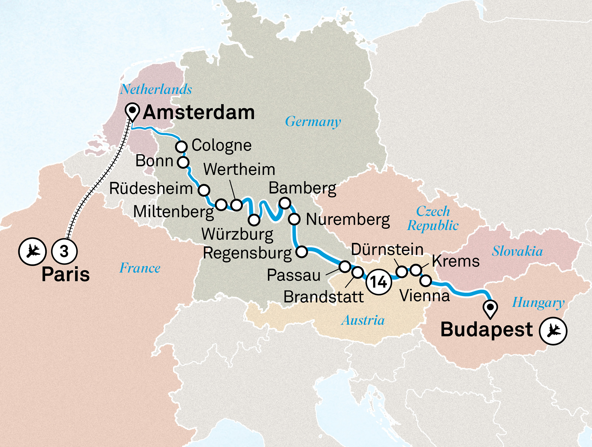 A region steeped in the history of ancient trade routes, today the rivers of the Rhine, Main and Danube meander through forested hillsides, idyllic vineyards and romantic towns. Cruise the canals of Amsterdam, through the magnificent Rhine Gorge, walk the WWII sites of Nuremberg and taste your way around Budapest’s famed Central Market. Authentic encounters will introduce you to local people so you can hear their stories and experience a taste of everyday life in the heart of Europe. After your cruise, spend a captivating four days in Paris. Explore the city’s highlights, discover the Bohemian backstreets and be immersed in art.