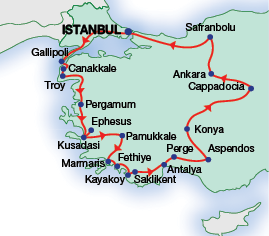 This comprehensive small-group tour of Turkey (maximum 28 people) is one of the most popular options. Visit Istanbul, Gallipoli, Troy, Pergamum, Kusadasi, Ephesus, Pamukkale, Fethiye, and Cappadocia. Enjoy accommodation in quality 4- or 5-star hotels and the services of an English-speaking guide, with free Wi-Fi available on the bus.