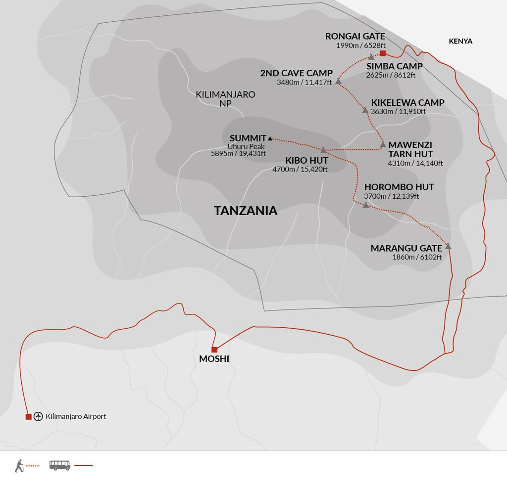 Passing the Hans Meyer Cave at 5,220 metres/17,126 feet, the climb slowly but surely ascends. At sunrise, we'll reach Gillman's Point at 5,681 metres/18,638 feet - the crater rim of Kilimanjaro - where the sun will start to warm the land. We'll soon forget the cold of the night and after a further hike of one to two hours, we'll reach Uhuru Peak at 5,895 metres/19,431 feet.