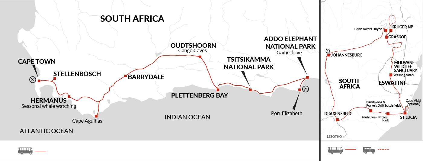 Travel through the heart of South Africa in search of the Big 5. On this ten-day trip, we'll delve into some of the country's most iconic national parks, including Kruger, hoping to spot the bounty of wildlife that calls these varied landscapes home. Along the way, immerse yourself in the history of the Zulu battlefield, explore the wetlands of St Lucia and rub shoulders with the Swazi people in Eswatini.