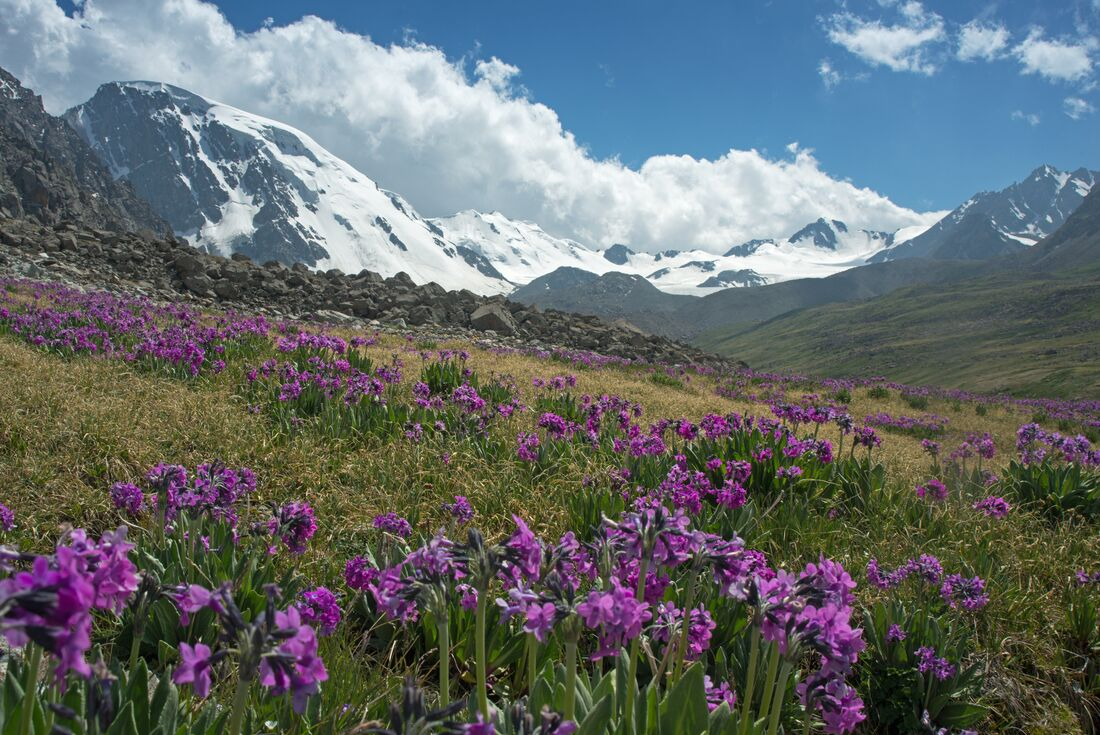 Refuel with breakfast then trek over the green pastures dotted with yurts of local nomads on your way to Irdyk Valley. Go from a red rock canyon through alpine meadows and forests to the peaceful valley with river and mountain views. This area has a unique array of flora and fauna, so keep your eyes out, especially for its varied species of birds, as your landscape shifts into forested slopes and the wide, serene valley framed by the snow-capped peaks. Tonight, camp among the forest on the bank of a crystal-clear mountain stream. Maybe enjoy a fire with your fellow travellers and recap the day’s adventure.